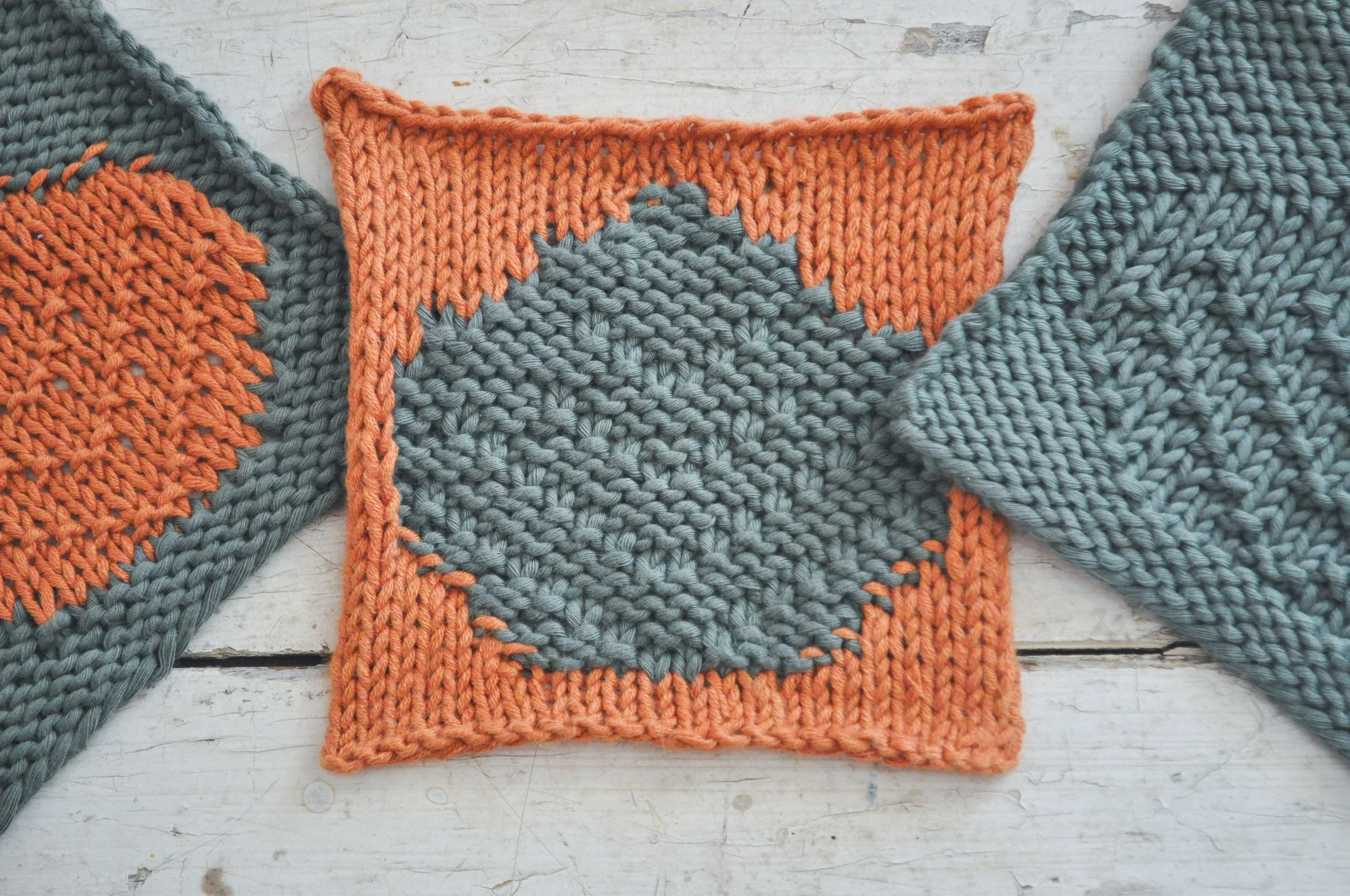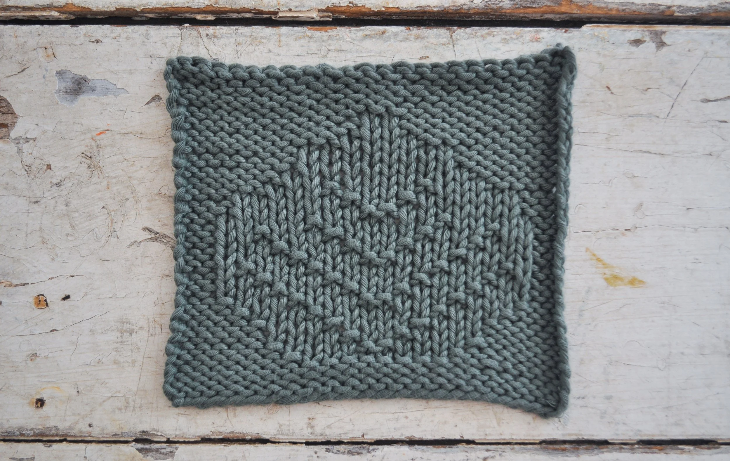 DK, aran or worsted weight yarn. (size of square will vary with yarn weight) I used We Are Knitters The Pima Cotton in Copper and Wool And The Gang Shiny Happy Cotton in Army Green