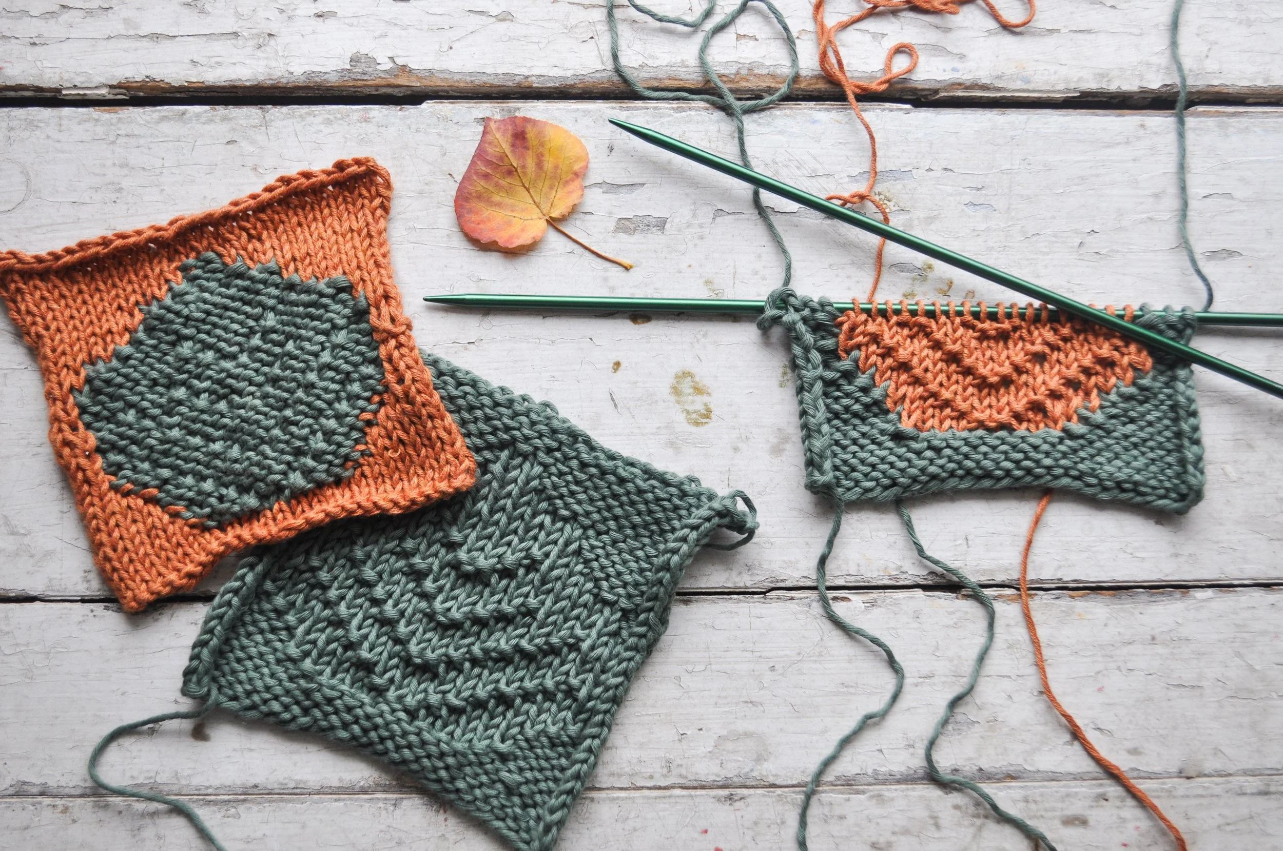 There are a couple options with this little cutie as well. You can make it all one color and showcase the pretty texture. Or you can add in a little intarsia color work. I did find that the best option for intarsia is probably using the top side of the leaf as your right side (shown in center below). Using intarsia and showcasing the underside of the leaf does not give as clean of a look to the finished graphic.
