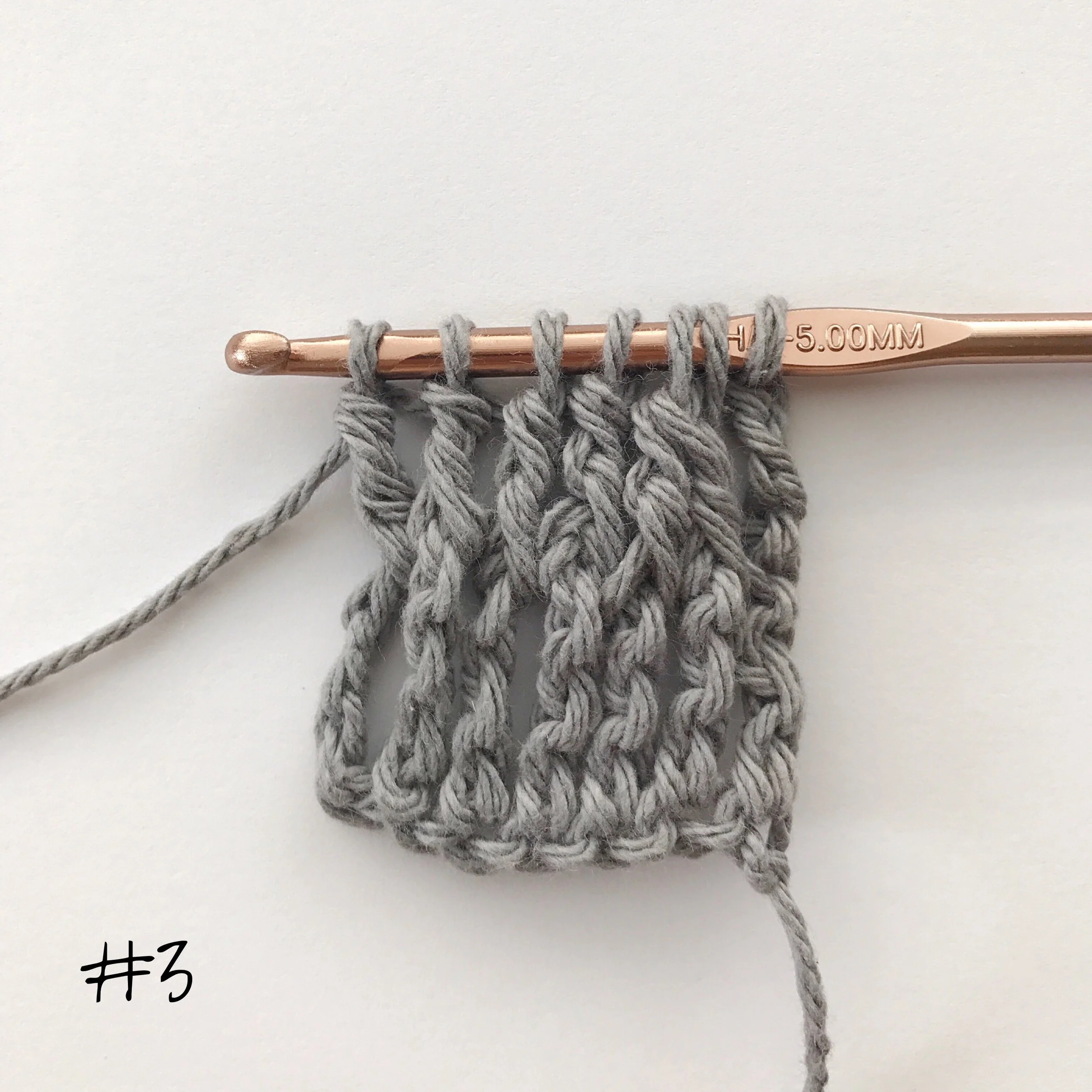 FPTR (front post treble crochet) - YO twice, insert hook behind corresponding post, (see photo example #2 below) YO pull up a loop, YO pull through two loops on hook, YO pull through two more loops, YO pull through remaining two loops.