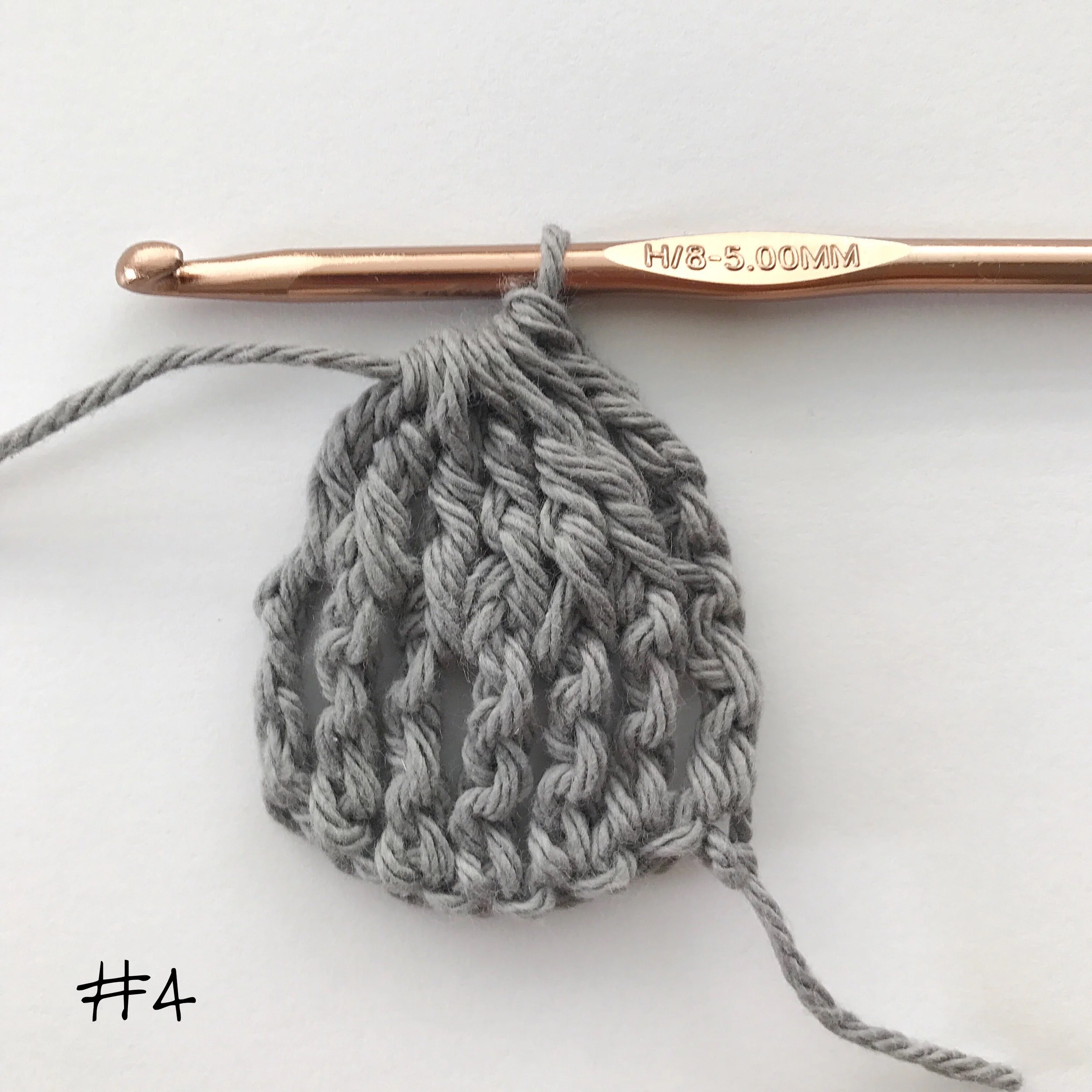 Note: For each 4 FPTR cluster you will be pulling through 5 loops on hook to finish and for each 9 FPTR cluster you will be pulling through 10 loops. Be sure to double check the count before pulling through. See photo example #5 below for what the RS of your work should look like.