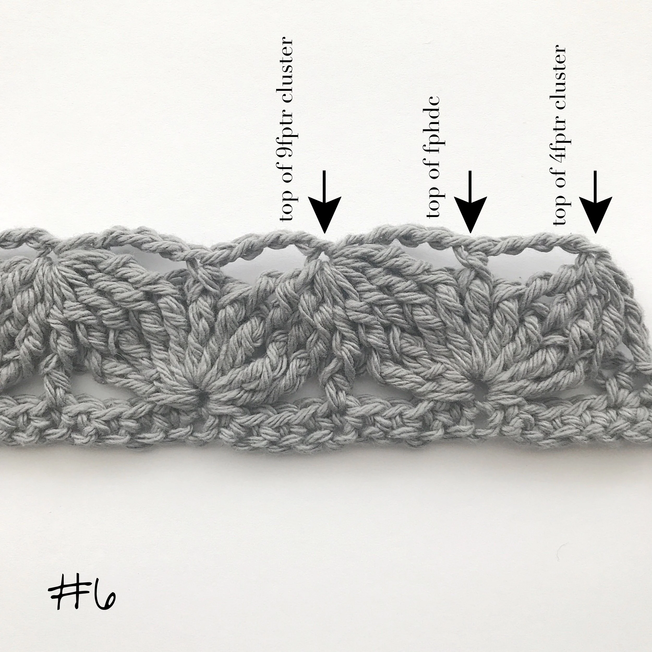 Round 4: CH 4, 4 TR in top of 1st cluster, HDC in next FPHDC, * 9 TR in center of next cluster, HDC in next FPHDC; REP from * to next to last cluster, 4 TR in top of 4 FPTR cluster; join with SL ST in top of CH 4. (see photo example #6 below for stitch placement)