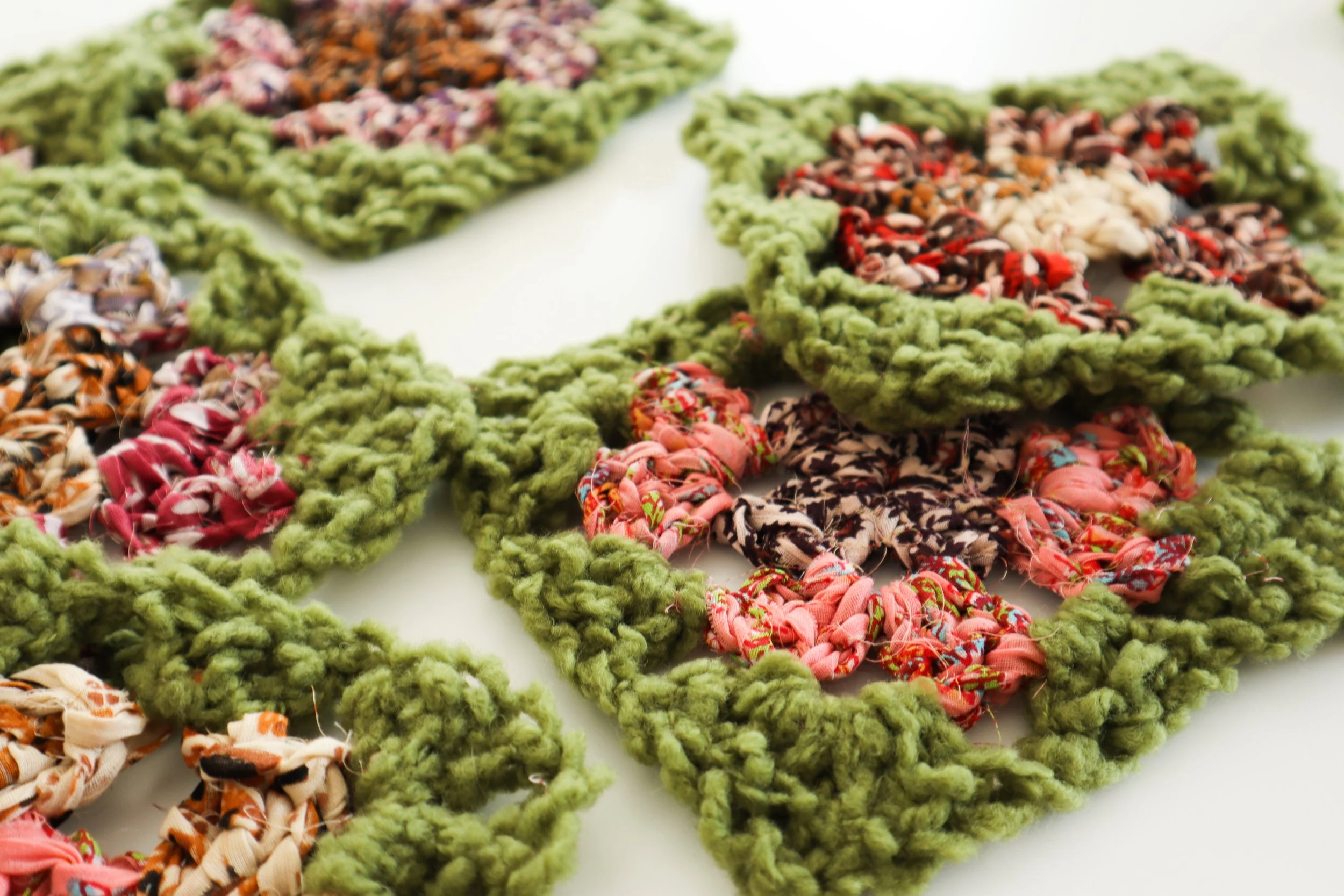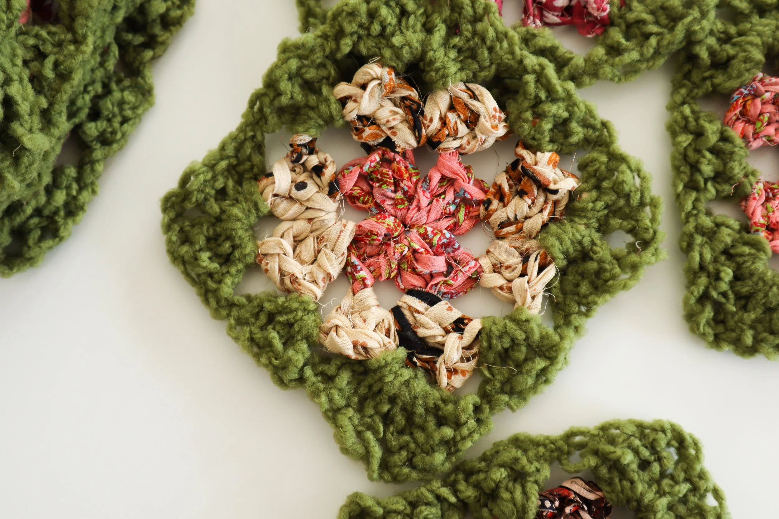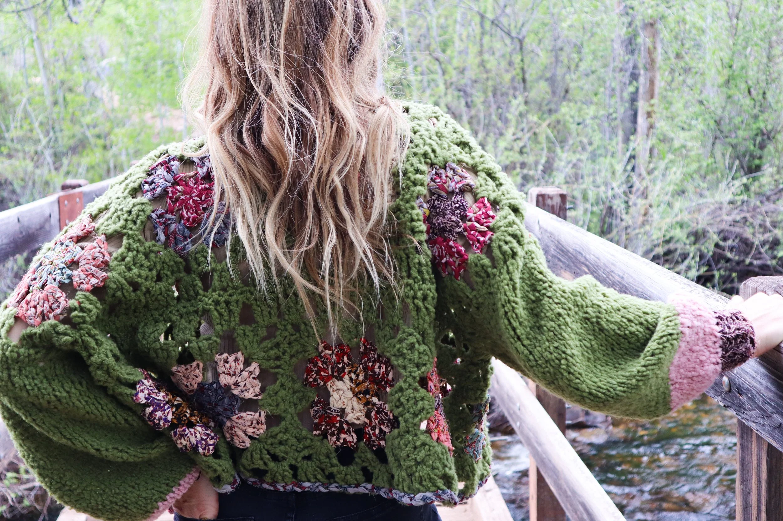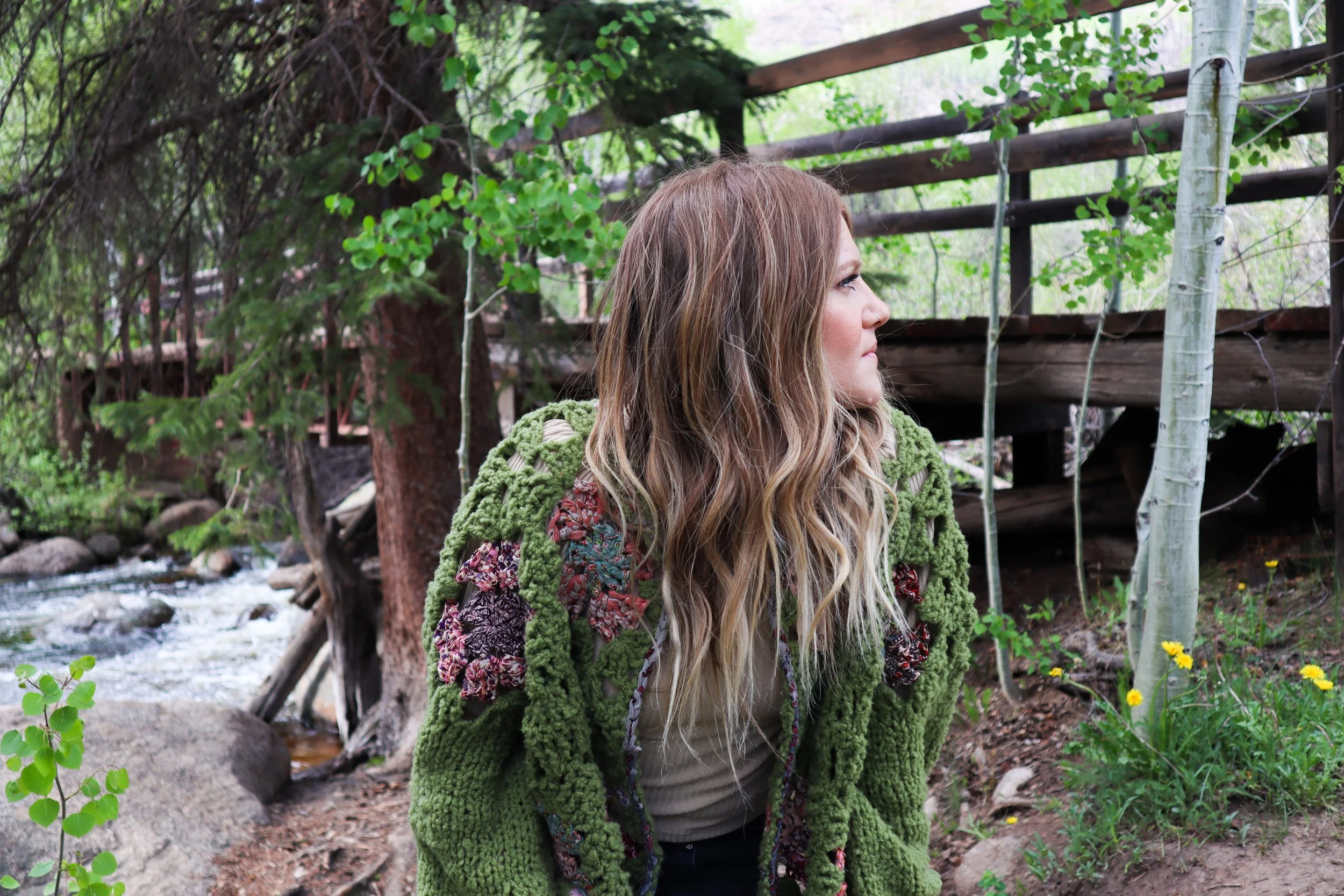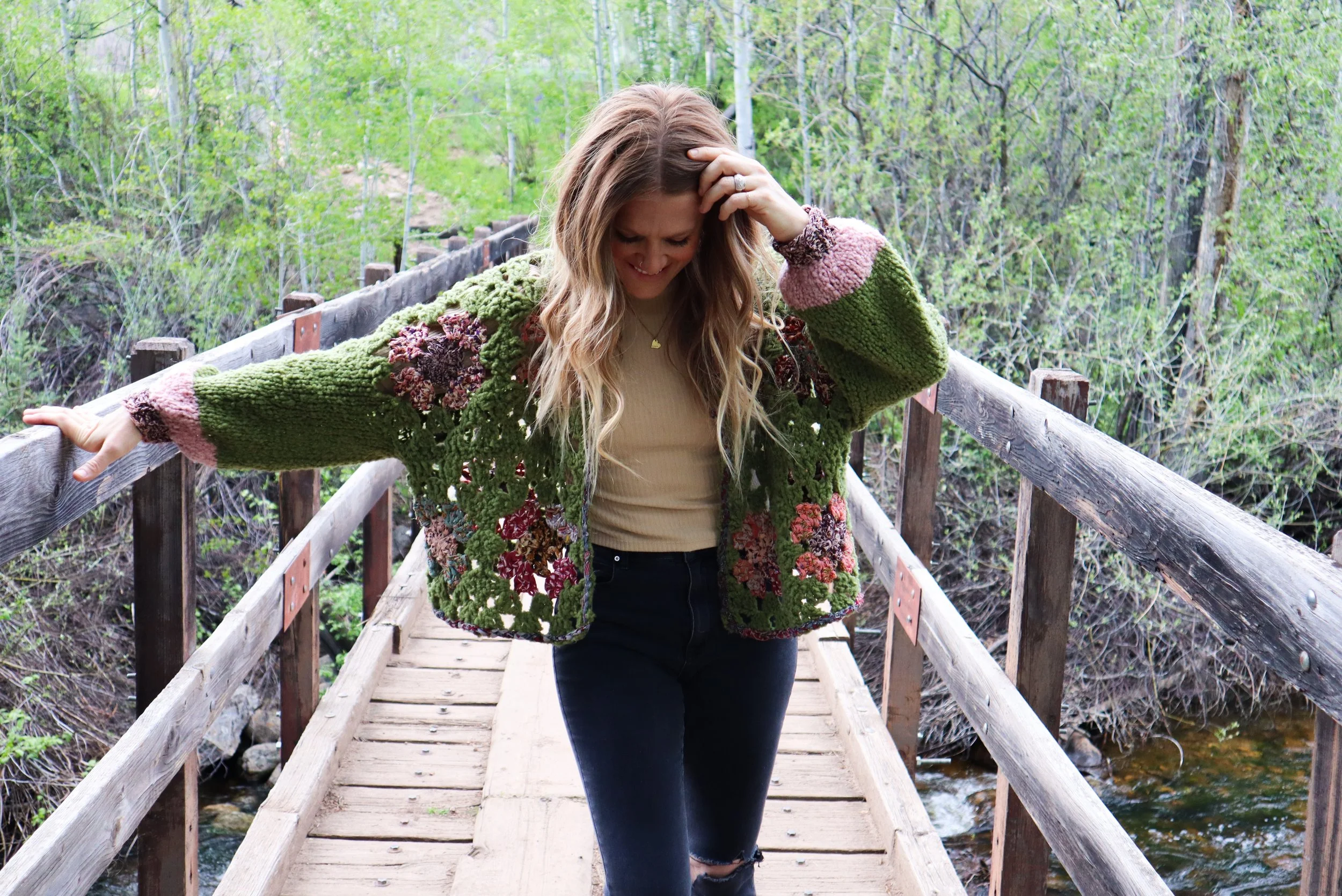 This crochet granny square cardigan design uses the Knit Collage Serenity Boucle Yarn as well as the Wildflower Yarn and Wildflower Mini Sampler. The Serenity Boucle is the color Fatigue Green and the two Wildflower Mini Samplers Kits are: