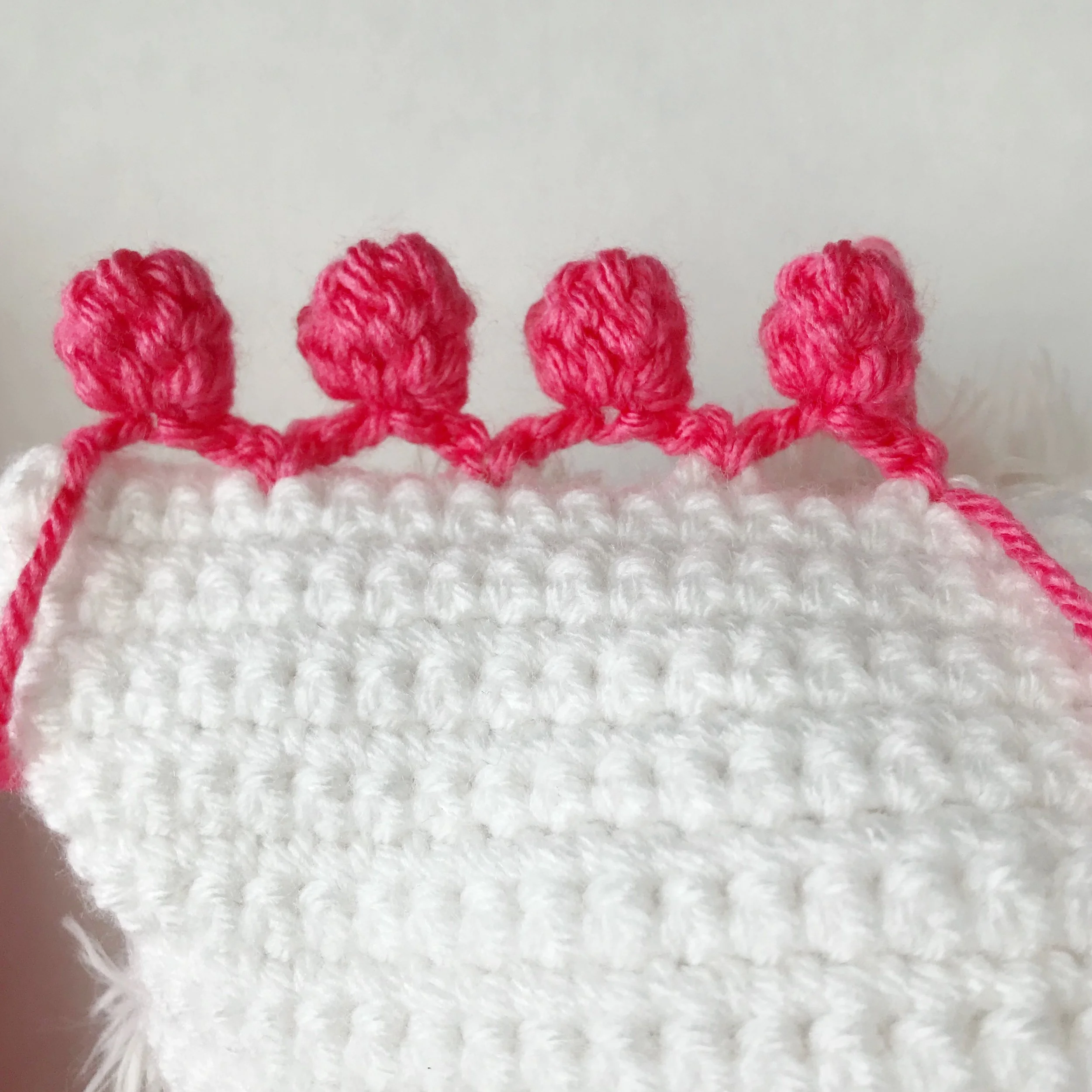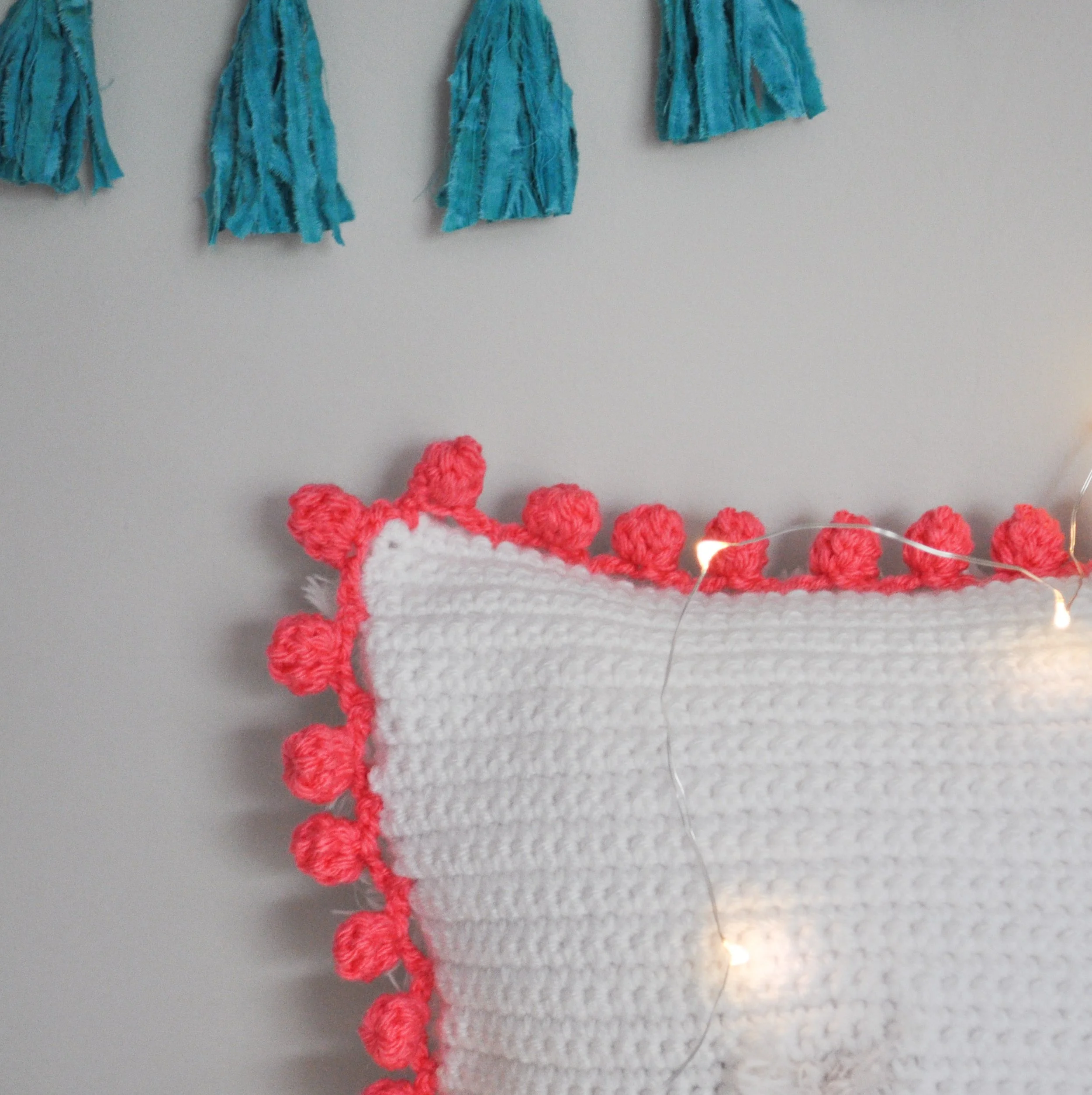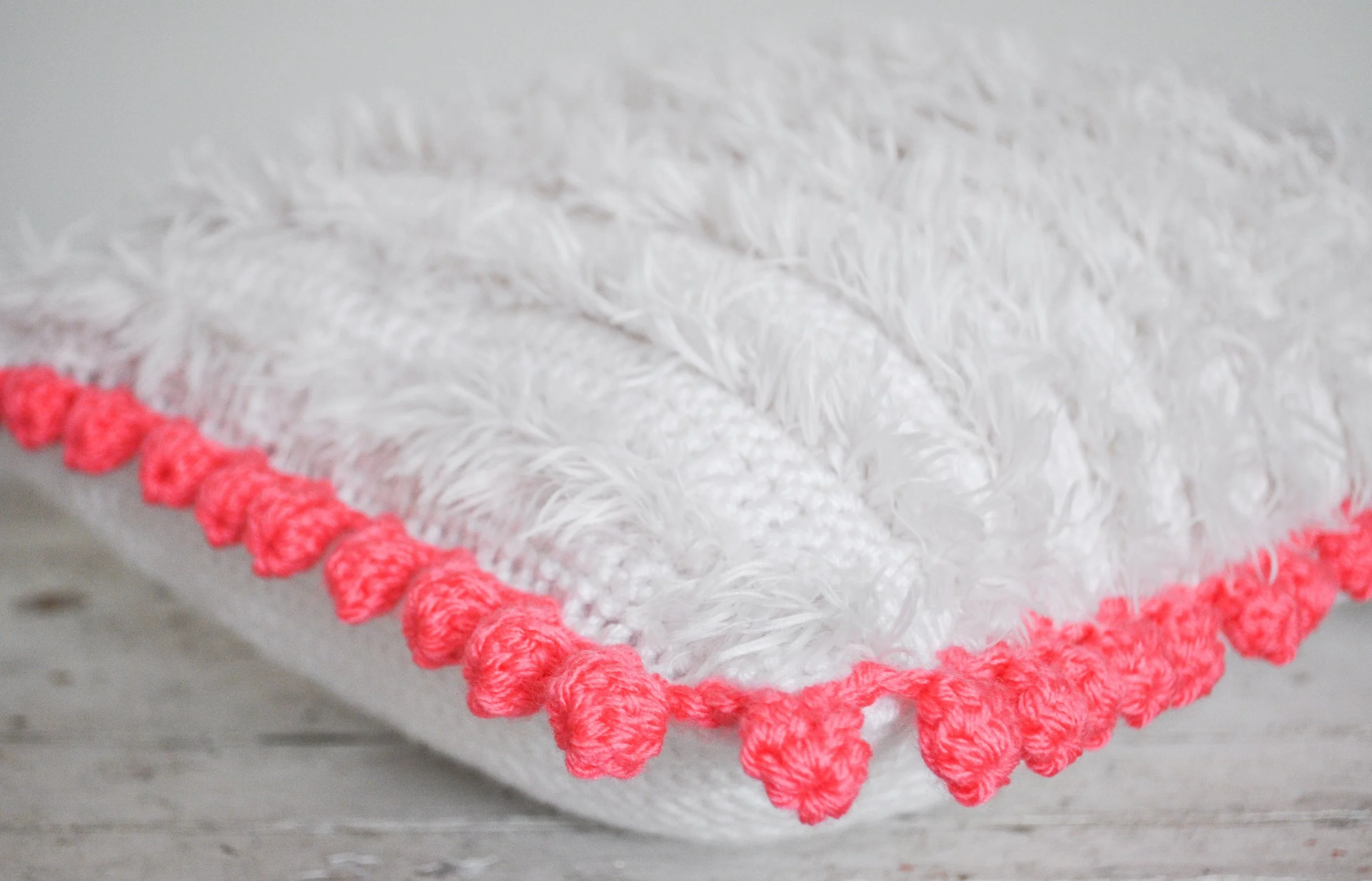 Be careful not to pull the pillow seam too much when making your bobbles. Hold the bobble at the base while you are working with it to prevent this from happening. Continue making your bobble border around all sides of the pillow until last bobble. For last bobble, work the same as the others, SLST approximately 1” from beginning base CH of bobble along the seam. To finish, SLST in the base of first bobble made. Fasten off. Weave in ends.