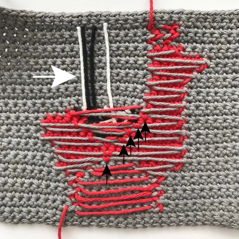 Crochet with main color until your graph calls for your contrast color. One stitch before your contrast color starts, begin working a single crochet (insert hook, pull up a loop…) before yarning over and completing your single crochet, (you will have two loops still on hook – above left photo) yarn over with contrast color instead of main color, and complete your single crochet by pulling the contrast color through the two loops on your hook (above middle photo). Keep the color you are not currently working with behind the working color when making your single crochets (see above right photo where the working color is the contrast color and the main color is behind).