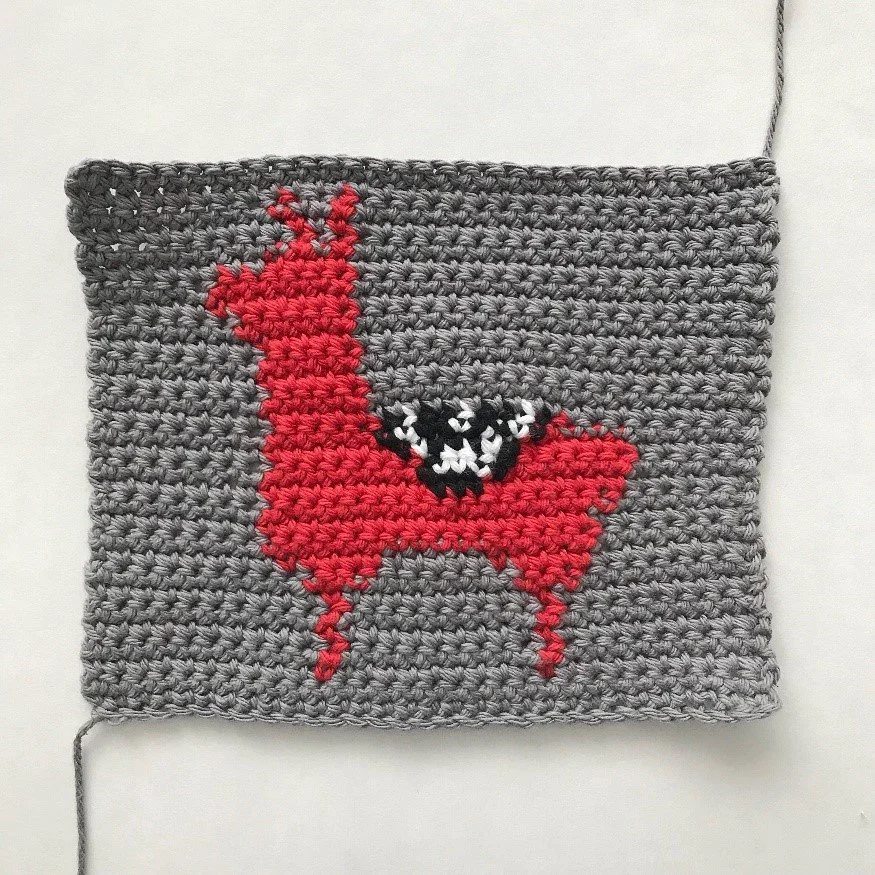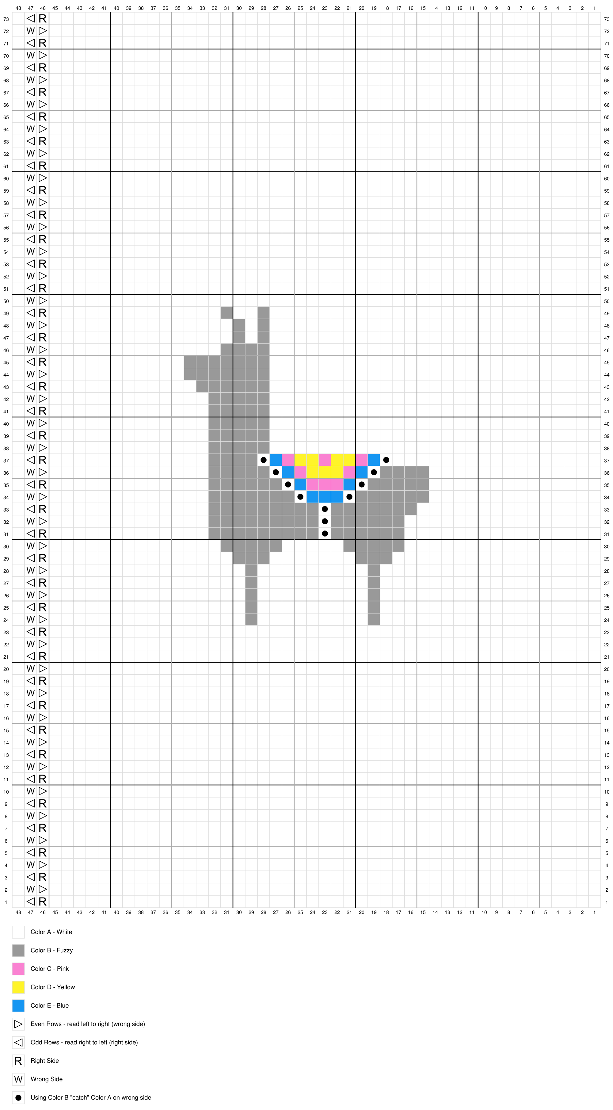 Rows 31-37: continue following pattern on graph. Begin catching your longer main color floats on row 31 as indicated on the graph and keep colors C, D, and E above colors A and B at all times (refer to white arrow in the practice llama square backside photo. Pay special attention to the symbols for caught stitches on these rows. Remember to work your color changes normally). (48 SC)