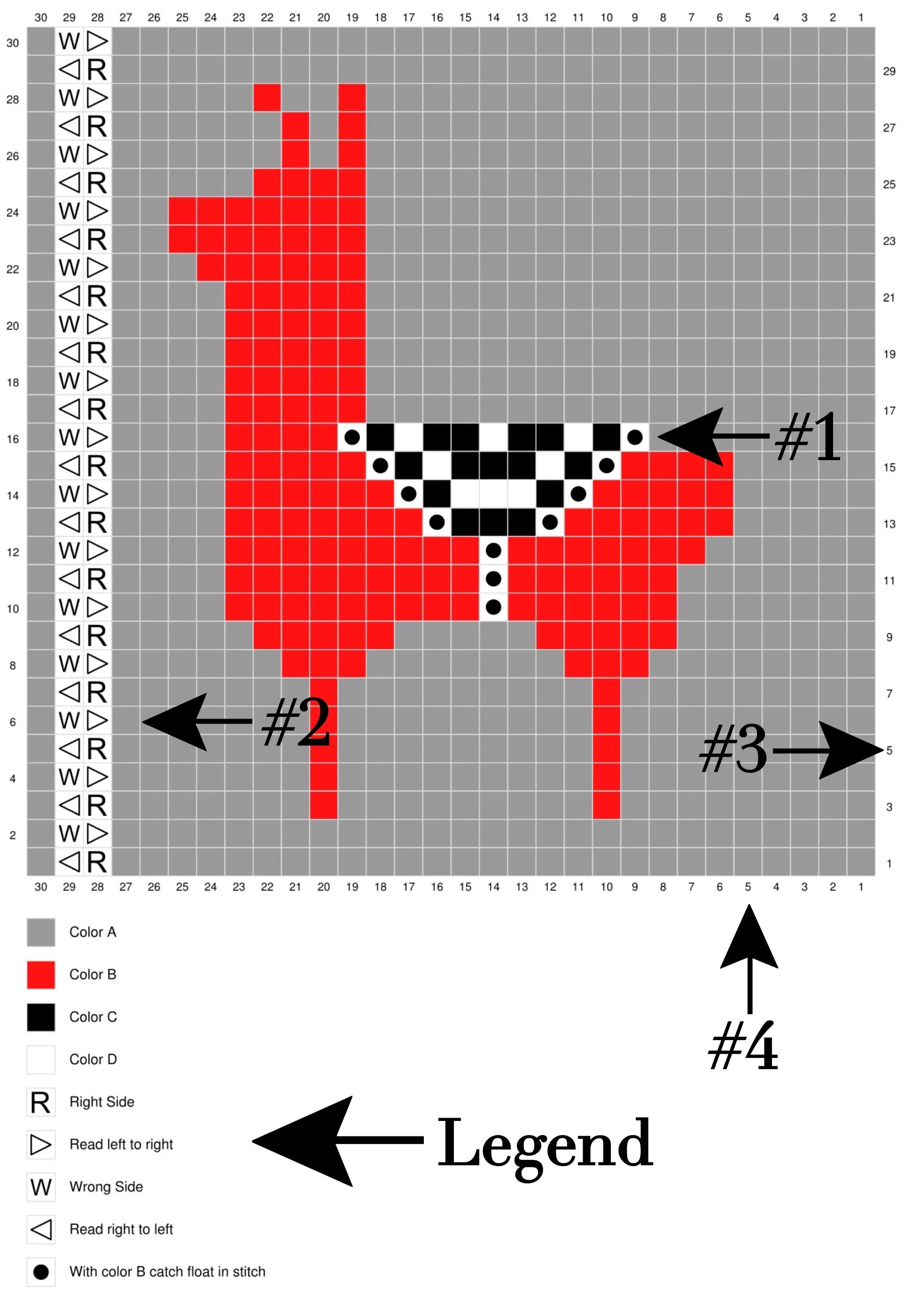 When preparing to crochet the pattern on your graph, be sure to check all symbols and colors in the legend so that you are familiar with the color changes, direction you will be reading the graph, right and wrong side of your work, and any other specific instructions before you start. The practice llama graph below is labeled with arrows and a brief description of what each one is pointing out. This graph is identical to the llama graph in the pattern (with the exception of the colors and extra non-llama graphic rows). You will read both graphs the same way. This graph is used in the rest of the tutorial as well.