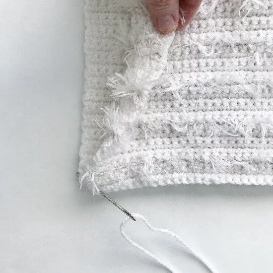 From left to right, SL ST across the top of the saddle, keeping your yarn tails on the WS of the pillow (above photo) Note: You will be yarning over on the WS and pulling your SL STS through on the RS.