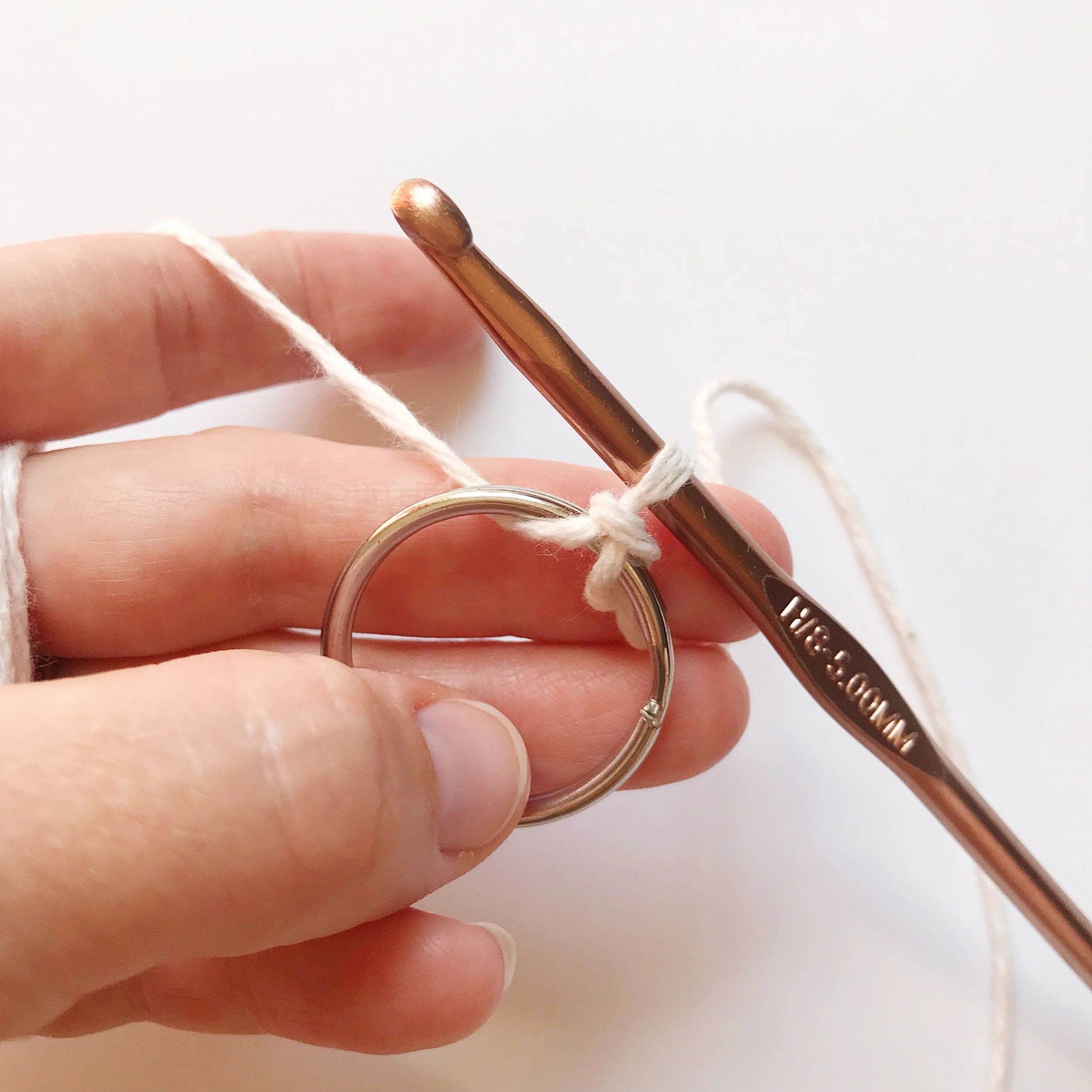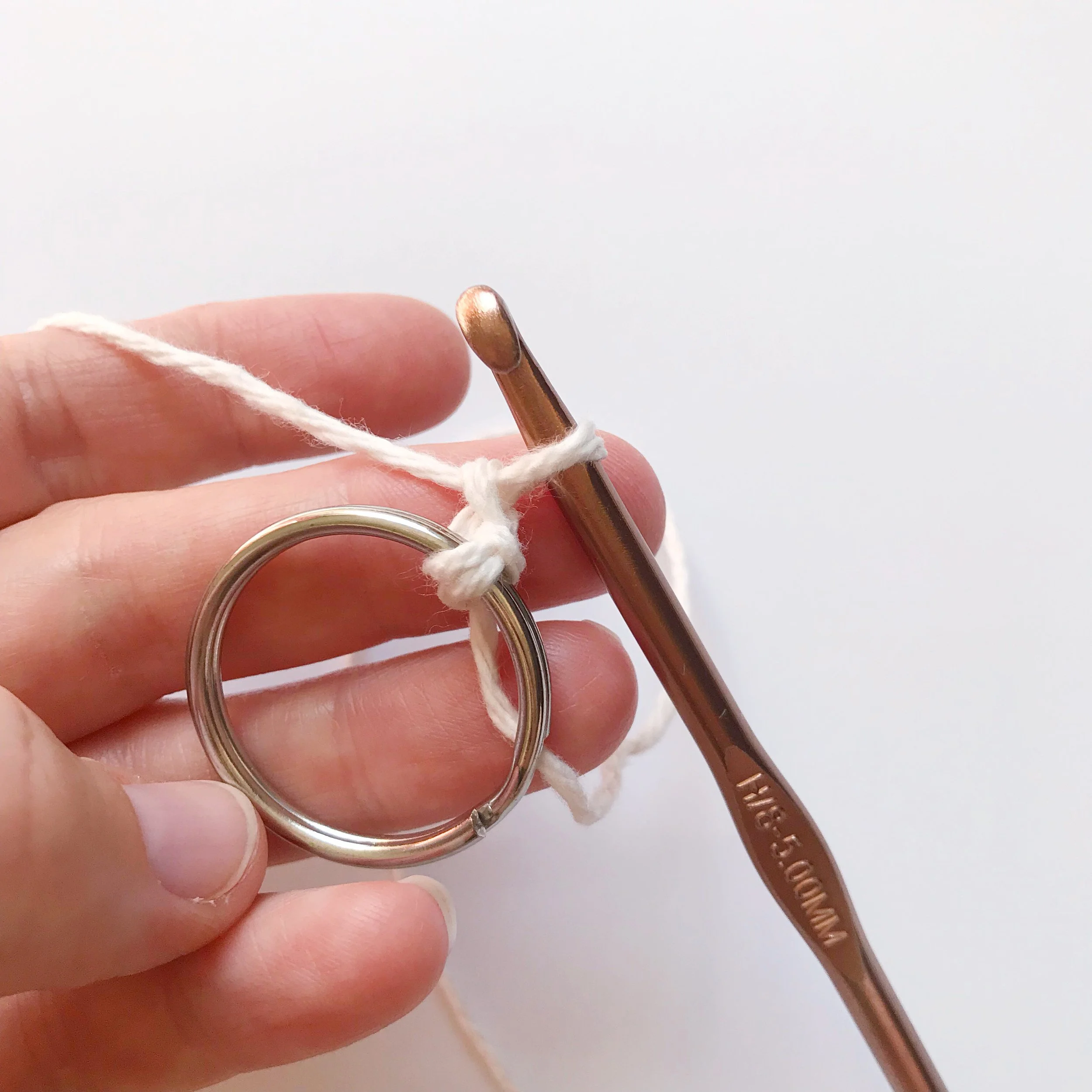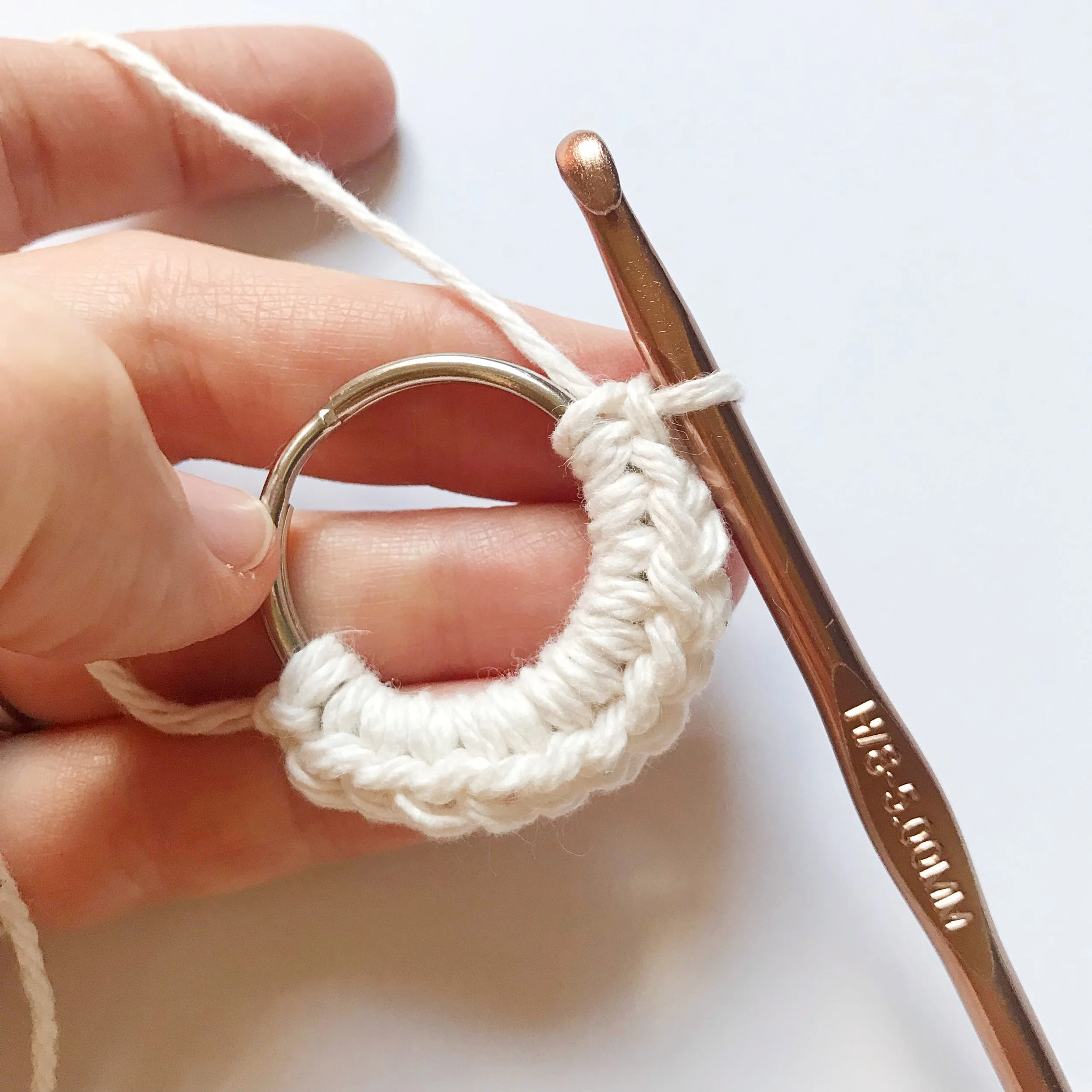CH 1, SC all the way around ring. Slide SC’s together as you go so that no keyring is showing. (photos below)