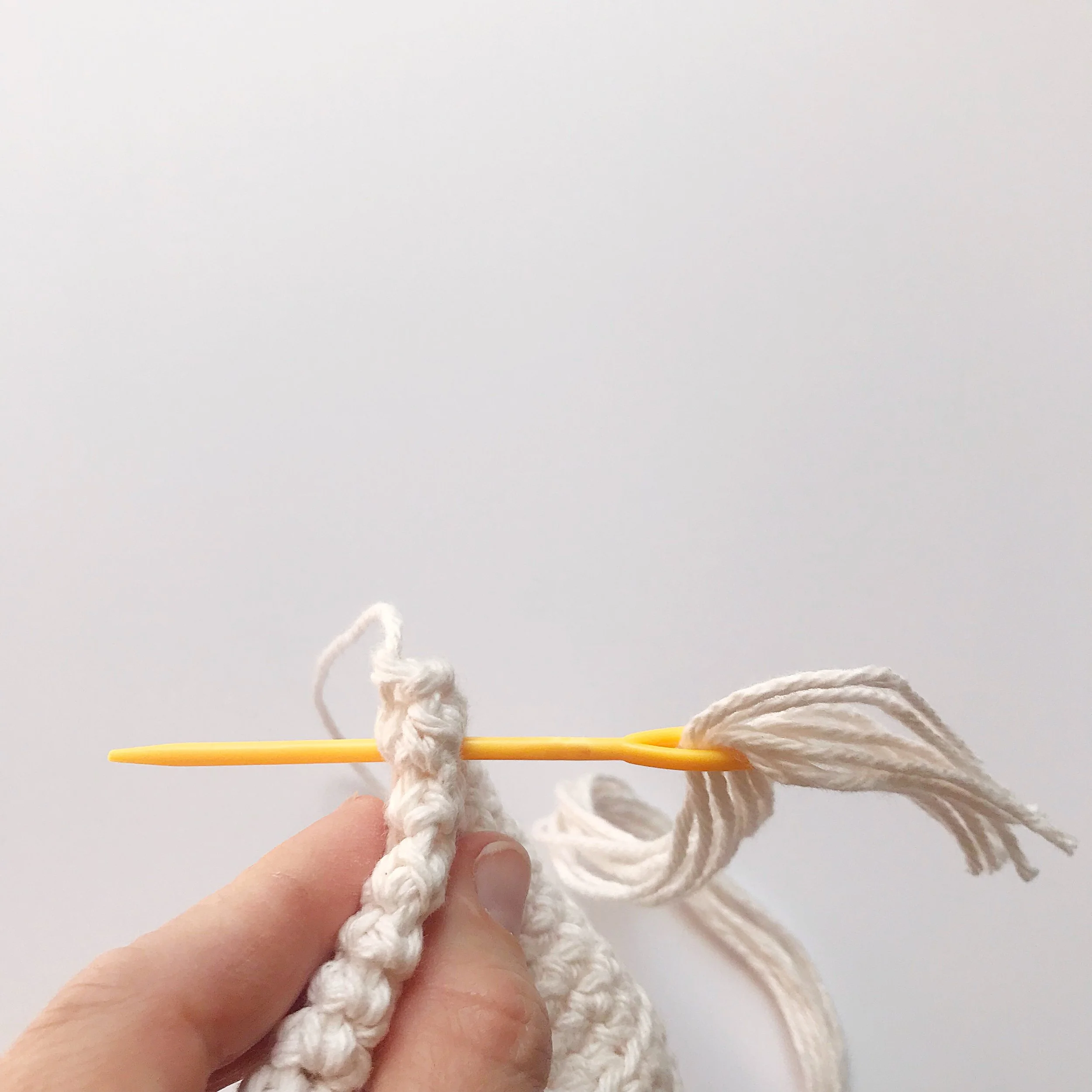 Cut 9 strands of yarn 15” long. Approximately ½” from bottom, with all 9 strands on tapestry needle (left photo below), pull them through the bottom of plant hanger until you reach the middle. Your yarn strands will measure approximately 7.5” on each side. (right photo below)