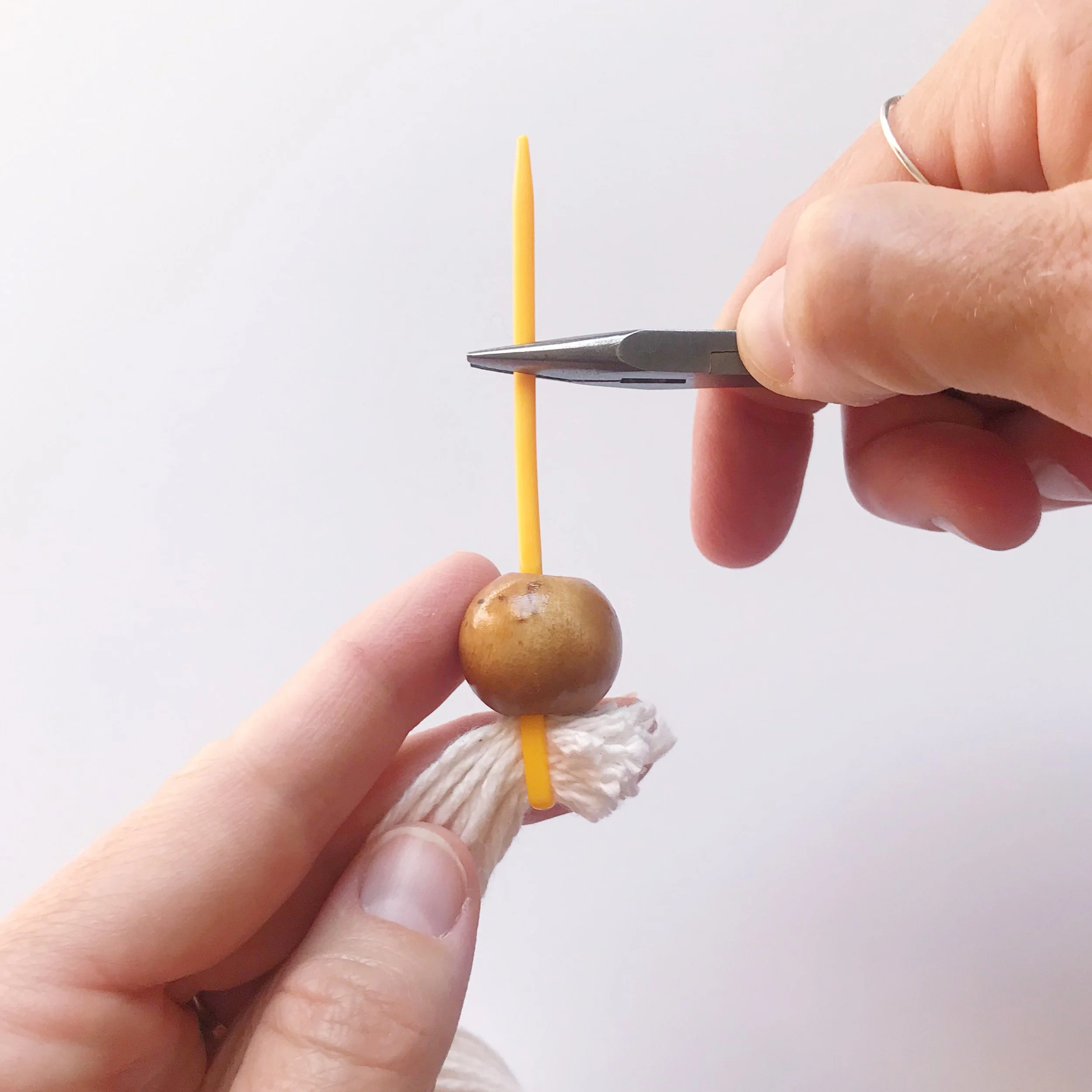 With tapestry needle, weave all yarn strands through 14mm bead. (left photo below) It may help to weave in one side of yarn strands through at a time for an easier fit. Bring bead up until it’s touching the bottom of the hanger. (middle photo below) Adjust all yarn strands so they are even and uniform. Tie a knot at the base of the bead. (right photo below) Trim tassel to desired length.