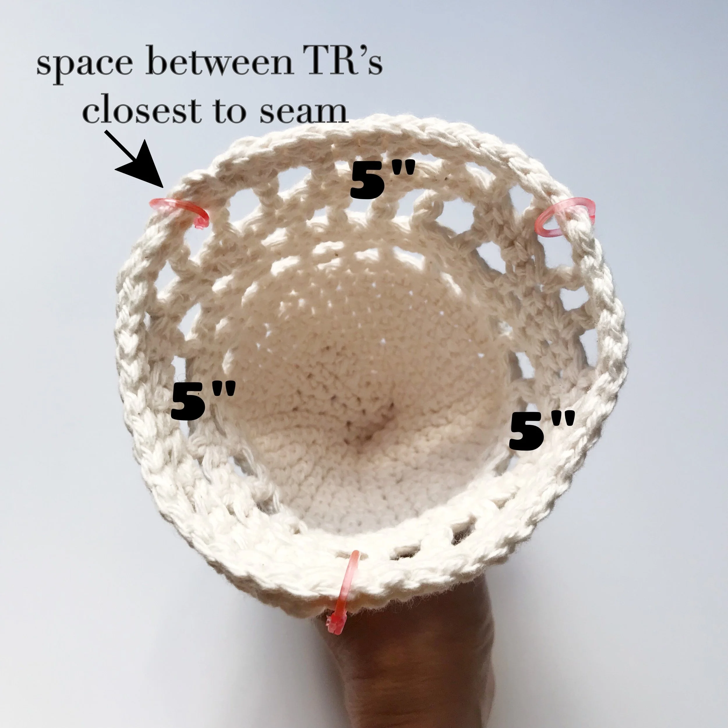 Place stitch marker in space between the two TR STS closest to seam. Measure 5” to the right of that stitch marker and place another stitch marker, then measure 5” to the left of first ST marker, place ST marker here as well. You should have approximately 5” in between each of the 3 ST markers. (photo below)
