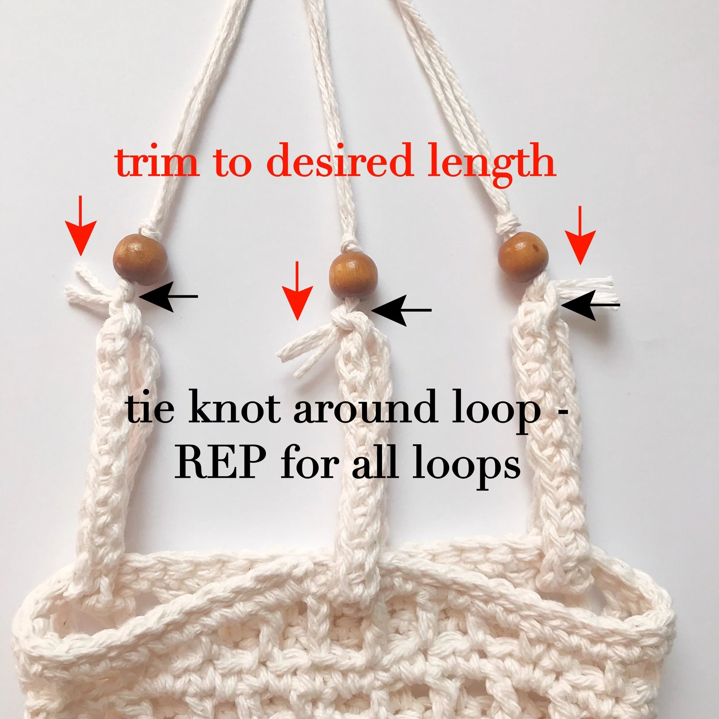Cut 9 strands of yarn 25” long (or desired length) and divide them into 3 sections of 3 strands. Holding one 3-strand section of yarn together, tie a knot around the loop. (black arrows in photo below) With tapestry needle and 3-strand section, string 10mm bead onto the knot just made. Tie one more knot on top of the bead. (photo below) REP these steps for the other two loops. Trim ends of knot strands to desired length. (red arrows in photo below)