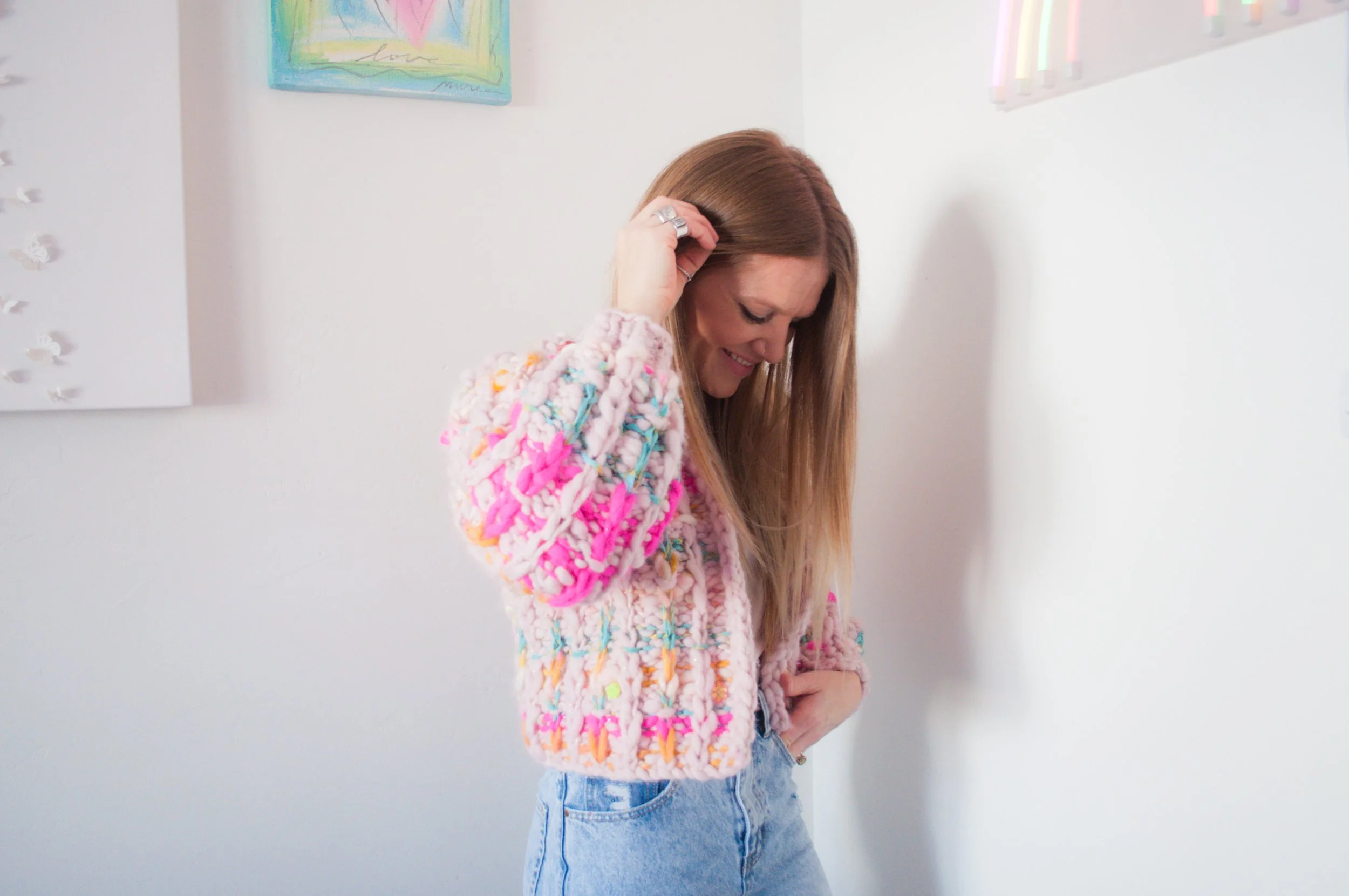 I decided to change it up a bit for the sleeves and go with an ombre effect. Starting with the Dreamland Yarn in Daisy Summer, I continued adding the brighter, warmer shades as I went down the sleeve...Cast Away in Wildflower, Daisy Chain in Sweet Papaya and Spun Cloud in Bodacious Pink...I finished with the Wildflower Yarn in Reflection Pool and just a tiny bit more of the Daisy Summer at the end before the cuff.