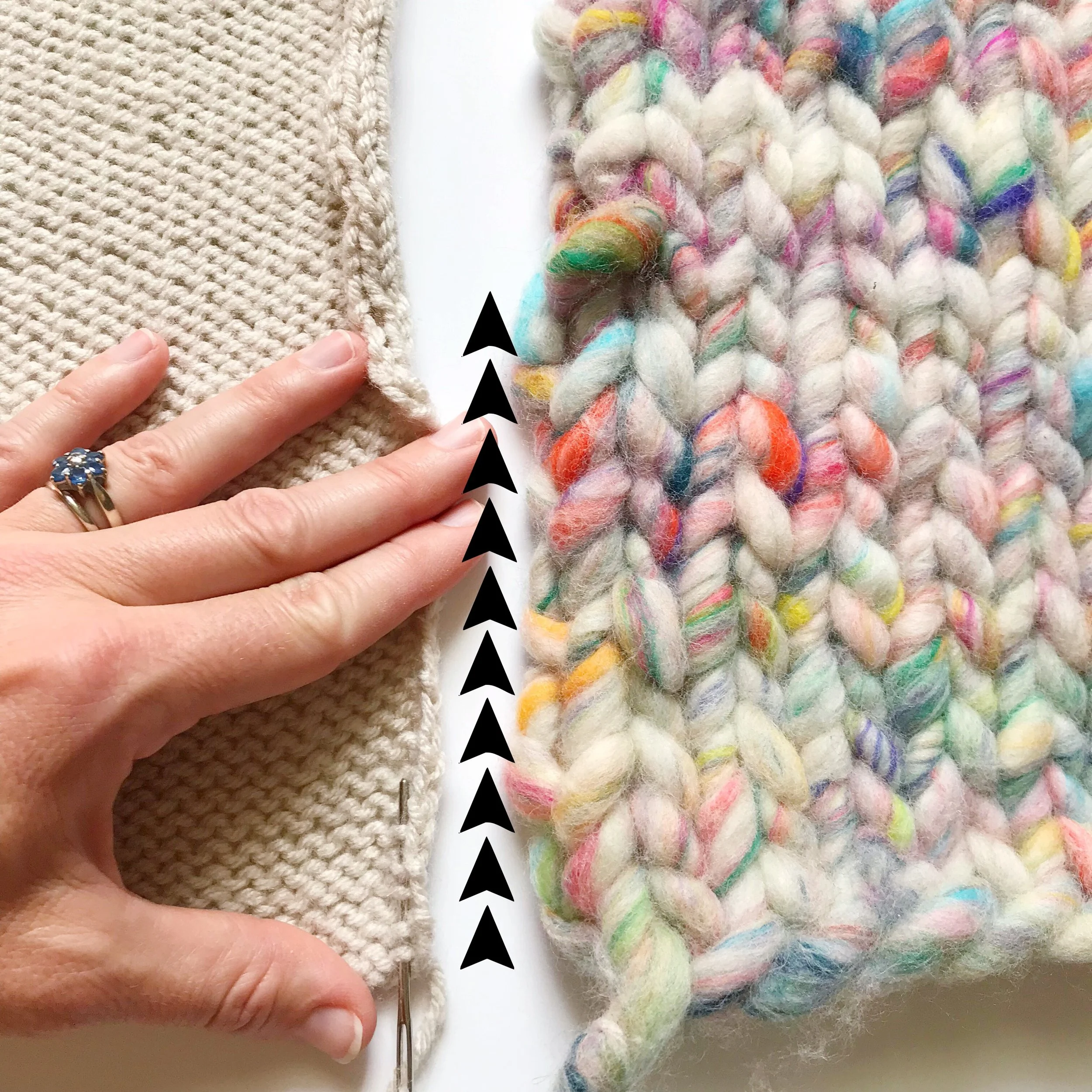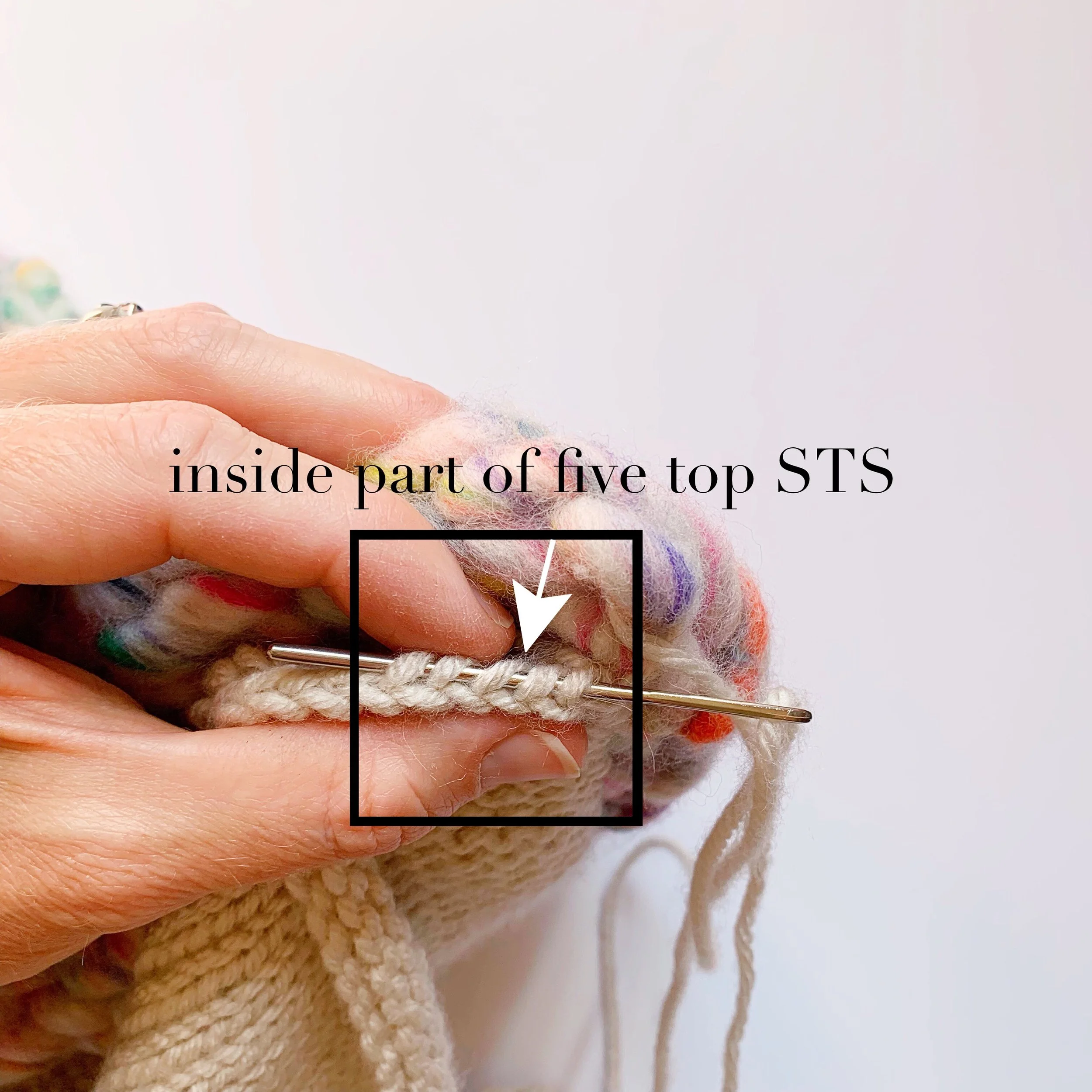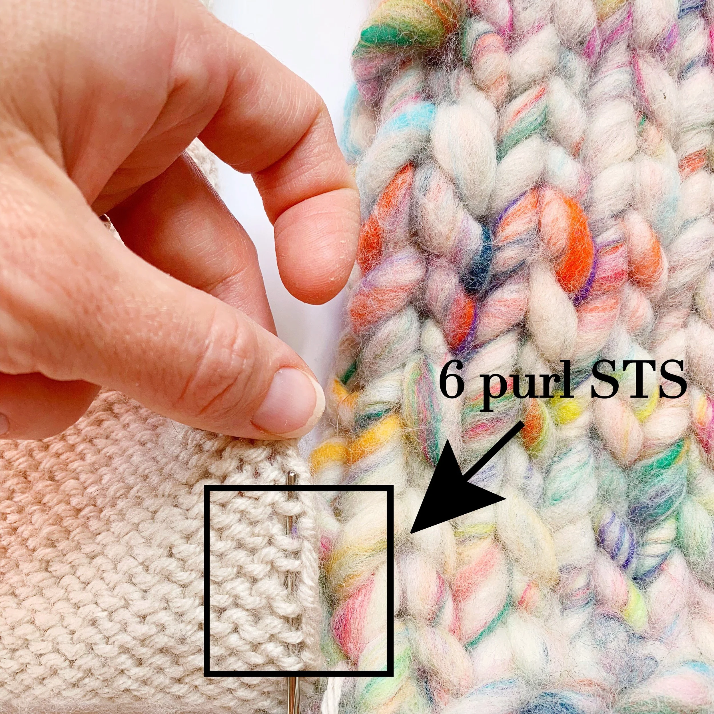 First, place tapestry needle under approximately 6 purl STS (ST counts may vary slightly. Be sure to keep them consistent across the entire side) from the right side of back panel, (right photo above) pull needle and yarn strand through.