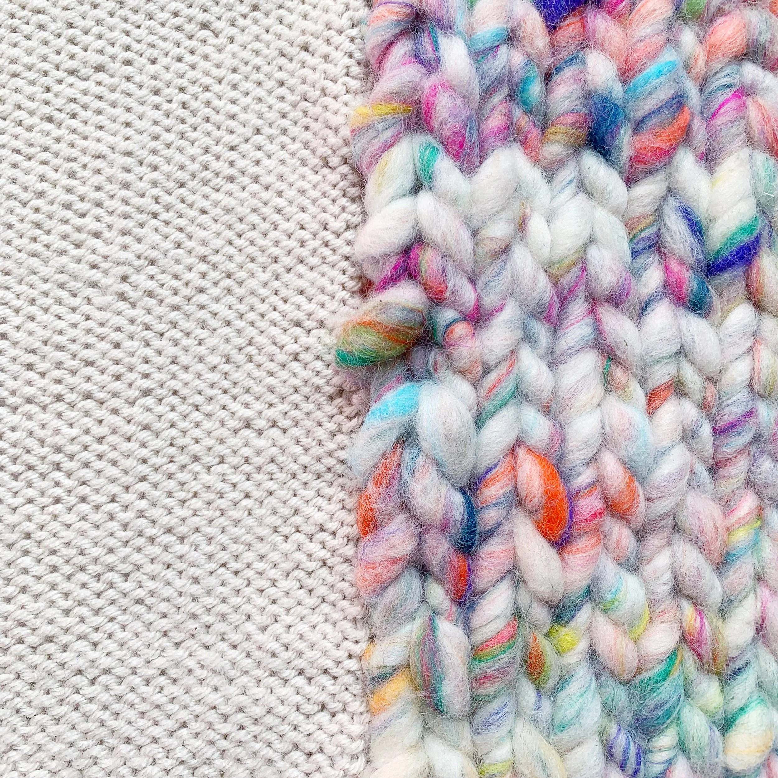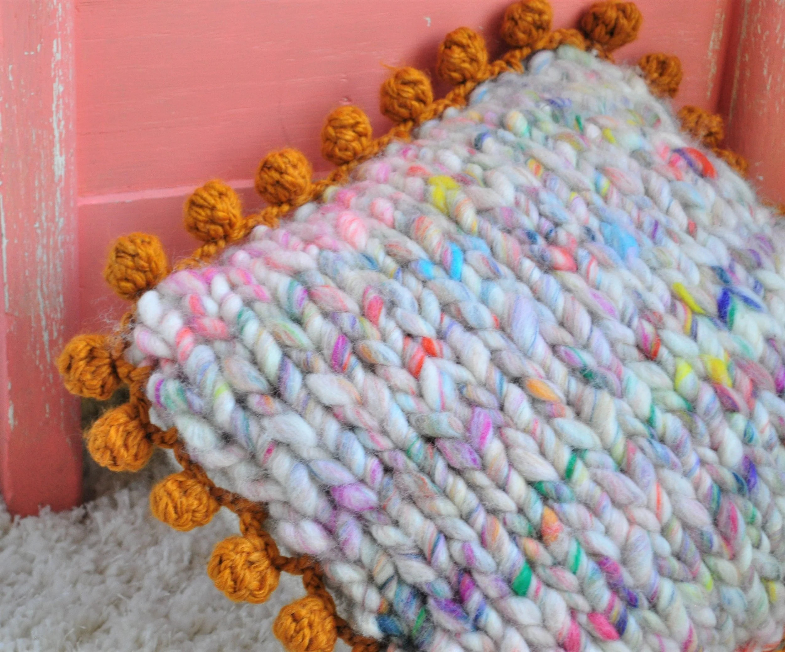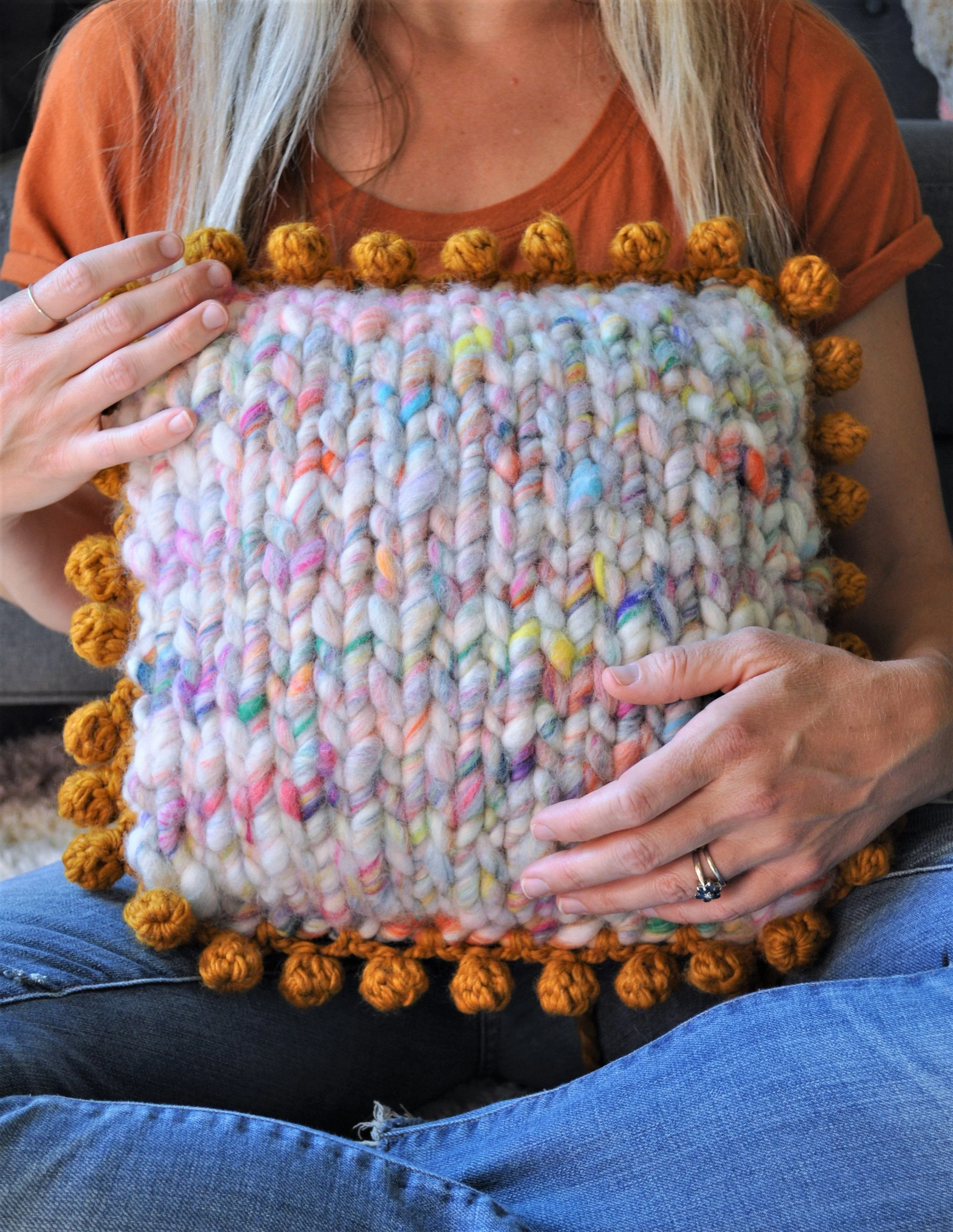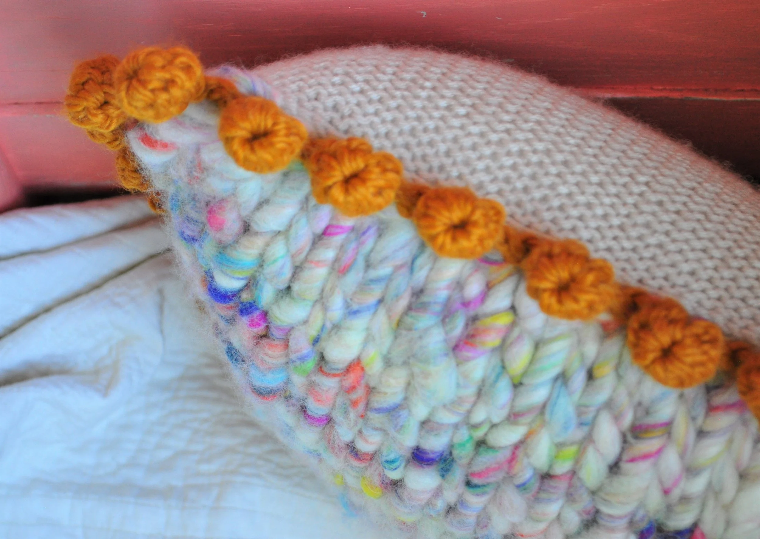 I couldn't resist playing with two (well, really three) different yarn weights for this knit and crochet pillow pattern. The star of the show is a gorgeous hand-spun yarn from Knit Collage for the front panel. It's complemented by the perfect neutral shade from Hobby Lobby for the back, and the pillow is complete with a pop of color from Lionbrand for the bobbles.