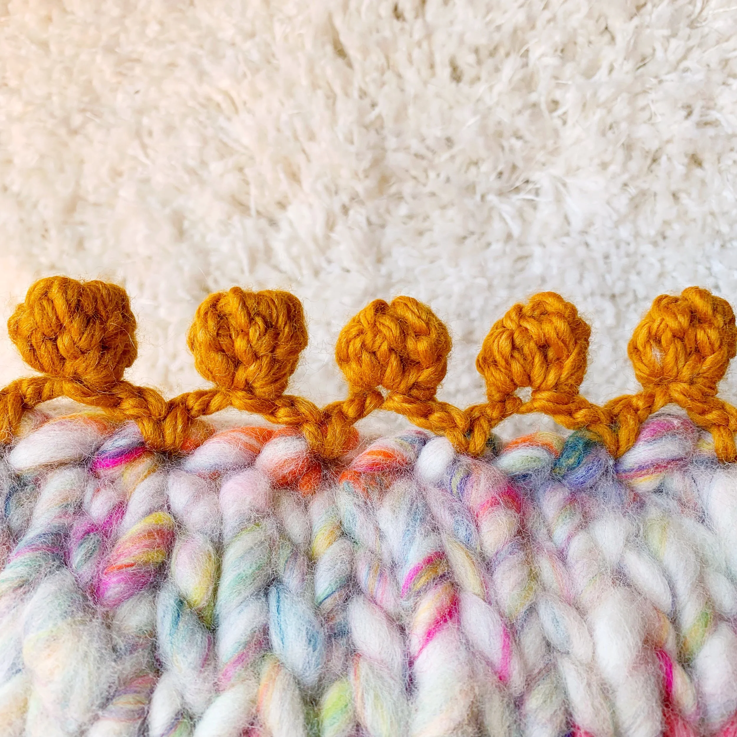 Be careful not to pull the pillow seam too much when making your bobbles. Hold the bobble at the base while you are working with it to prevent this from happening. Continue making your bobble border around all sides of the pillow until last bobble. To finish, SLST in the base of first bobble made. Fasten off. Weave in ends. Enjoy your new pillow!