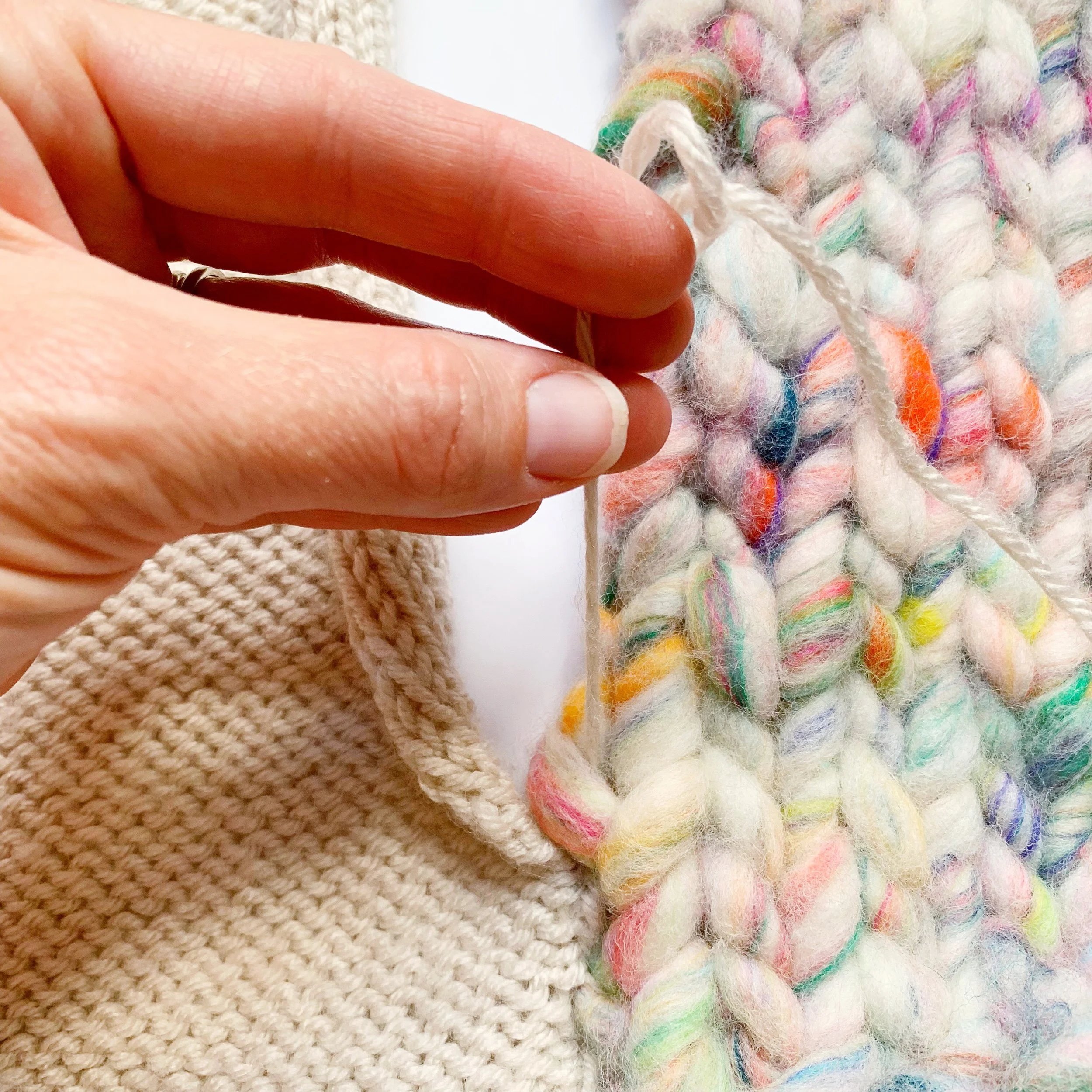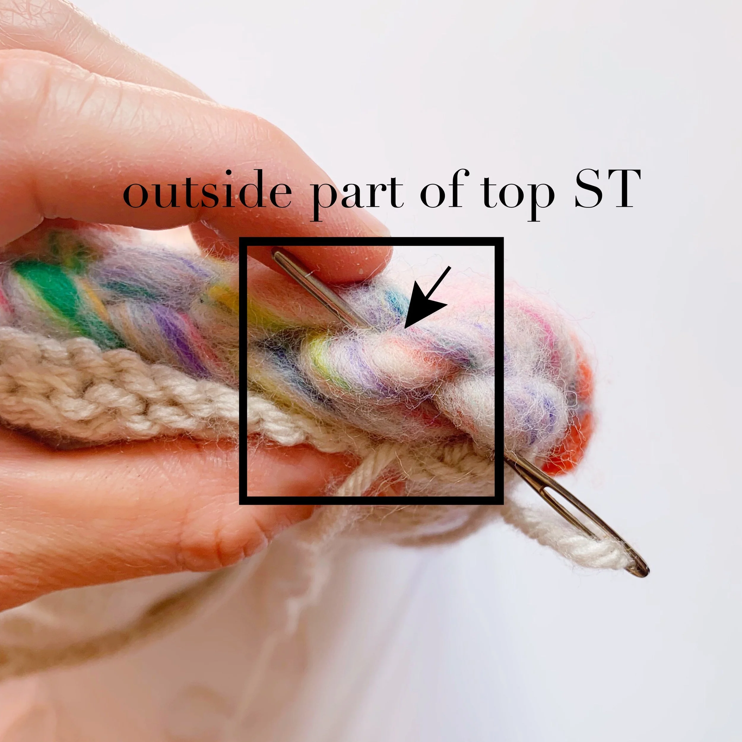 First, insert tapestry needle with yarn strand through the inside part (left photo below) of approximately 5 top STS (ST counts may vary slightly. Be sure to keep them consistent across the entire top and bottom) from your back panel. Then, insert tapestry needle through the outside part of 1 top ST from your front panel. (right photo below)