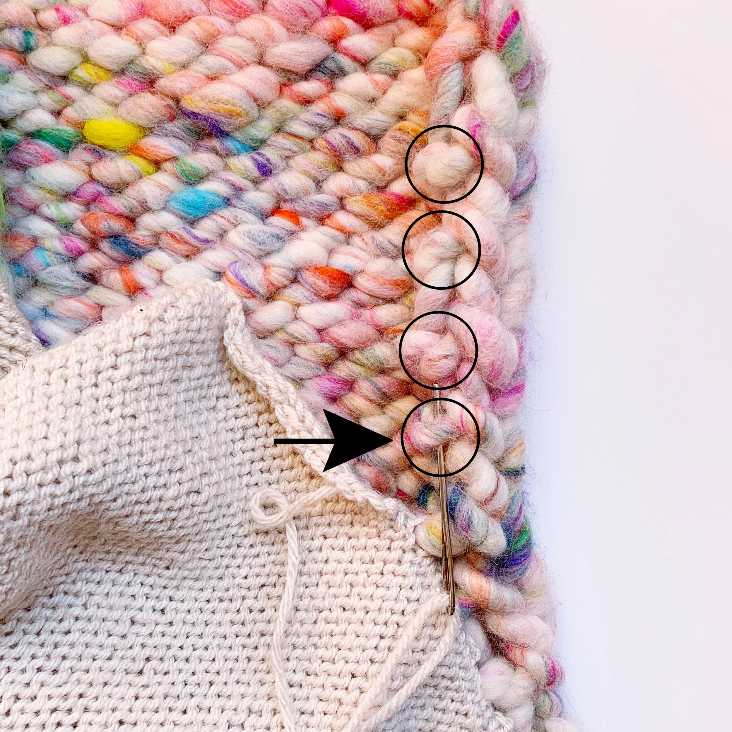 Seam right side the same as the left, except instead of inserting the tapestry needle through the left-slanted part of the ST on the front panel, you will insert it through the part of the ST indicated with circles in the photo below. (Be sure to keep your ST count consistent.)