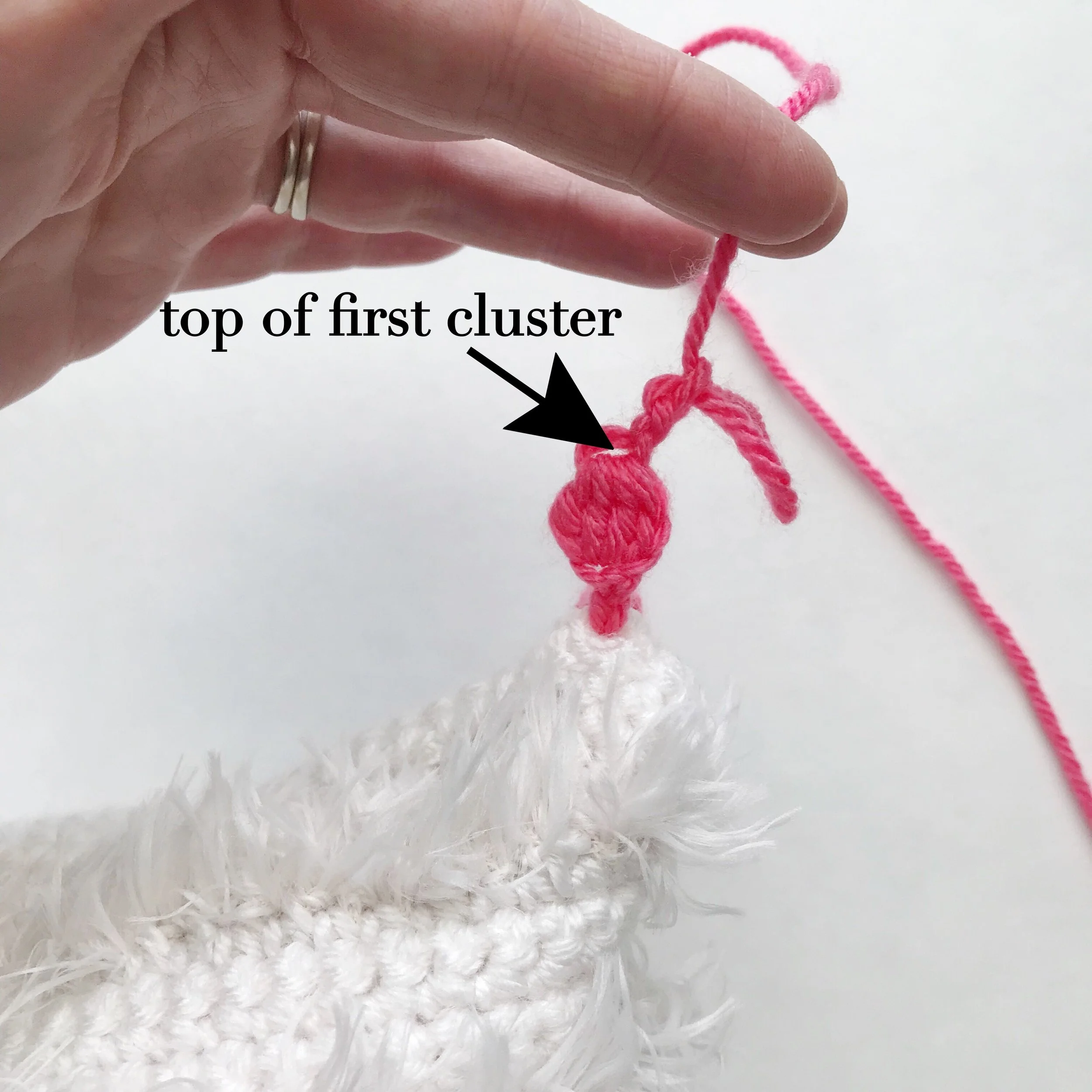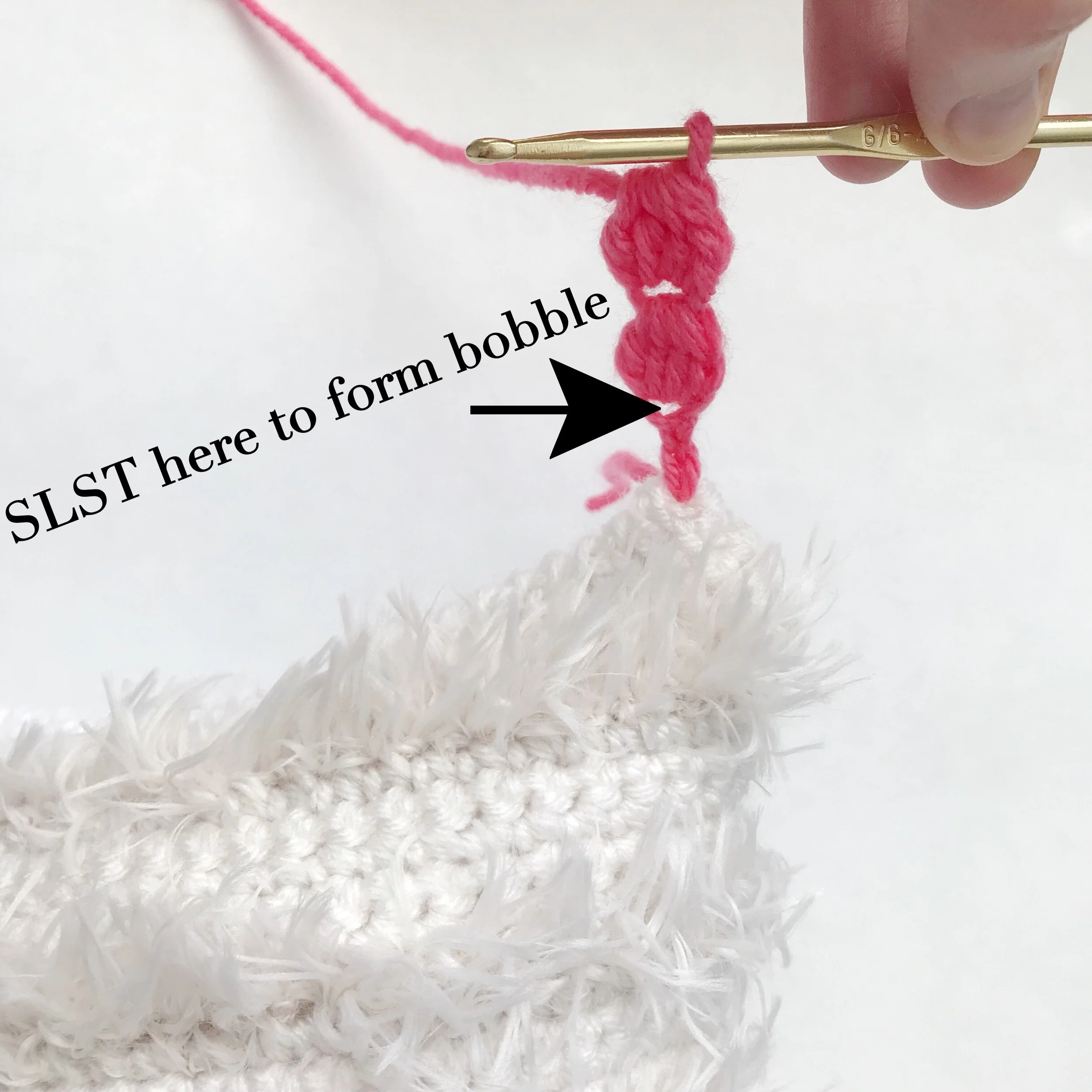 CH 2, attach with SLST approximately 1.25” from beginning base CH of bobble along the seam. (photo below)