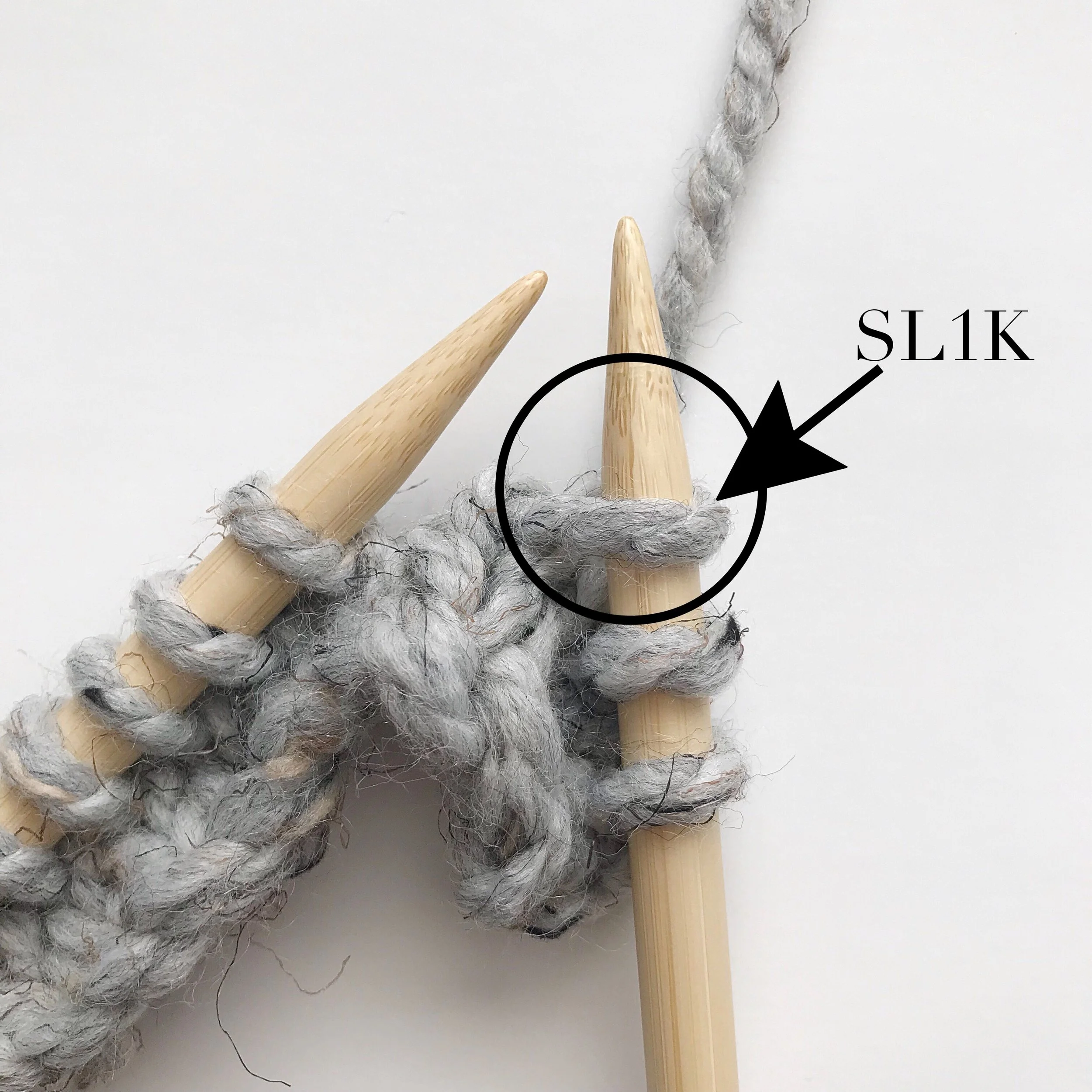 SL1K (slip 1 knitwise) – insert needle knitwise as if you were about to knit a stitch (see photo #1 below) slip that stitch onto right needle without yarning over to knit. (see photo #2 below)