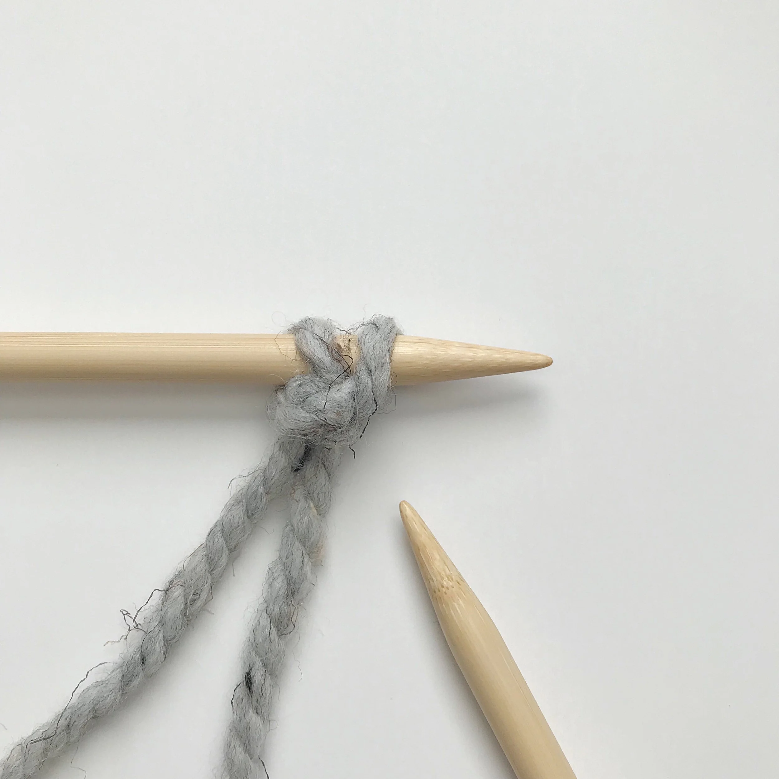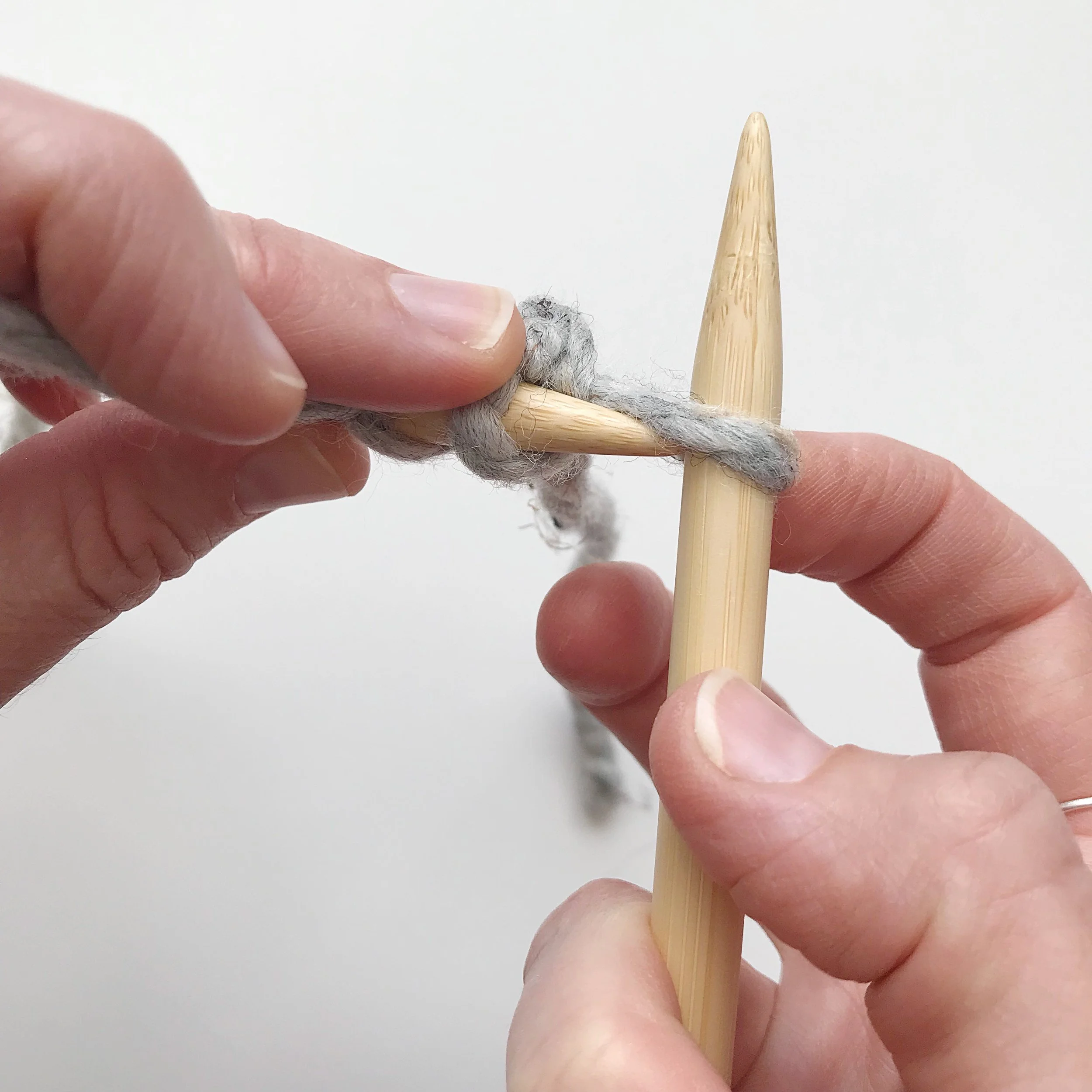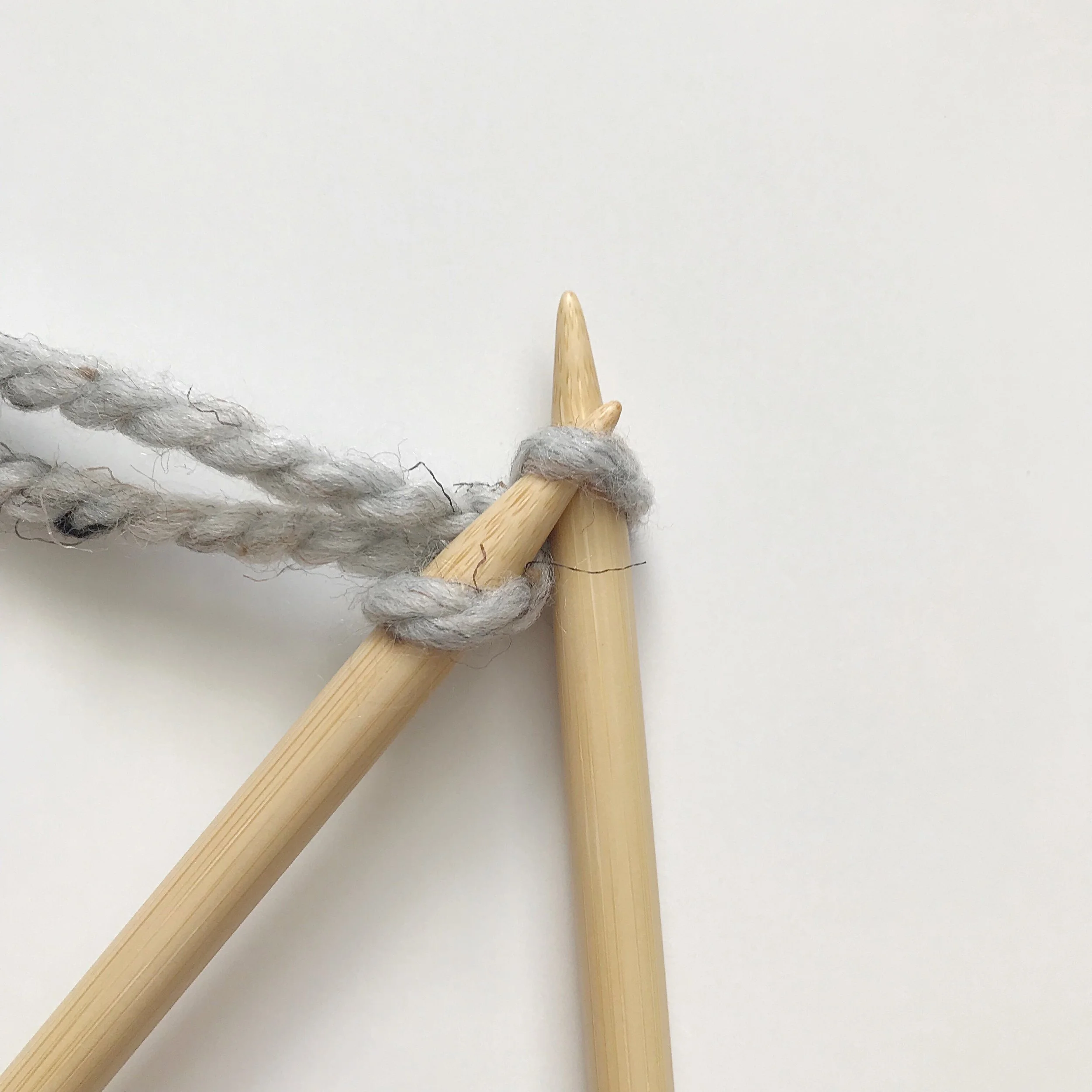 Begin with a slip knot on your left needle. (photo #1) Start as though you were about to knit this stitch, but do not take your slip knot off your needle. (photo #2) Instead, insert left needle behind the stitch on right needle and slip it onto the left needle. (photo #3)