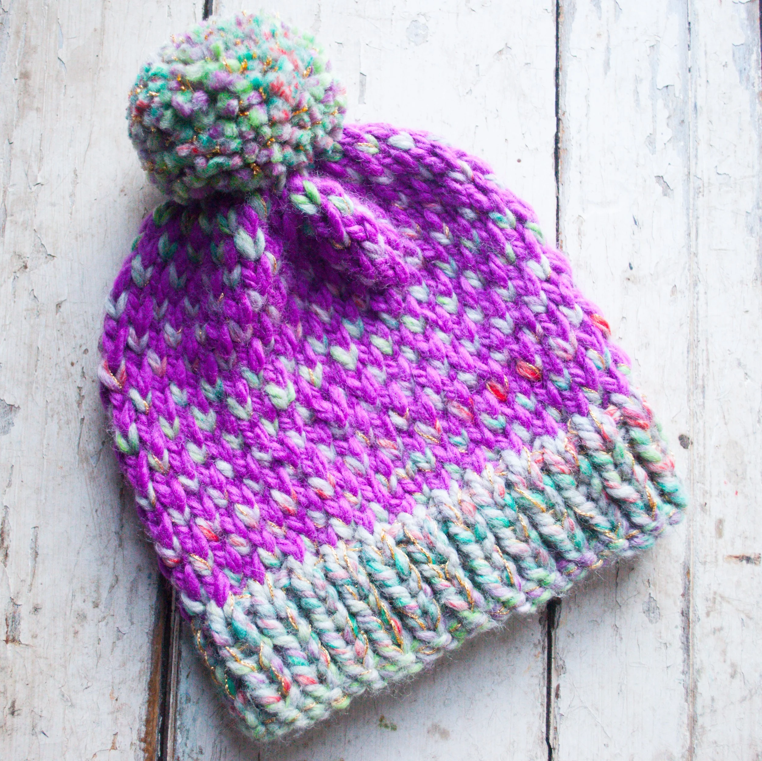 This stylish knit beanie is such a fun project to knit! The cool stitch pattern is easy to learn and creates lots of visual interest. That paired with the sparkly thread and multi-color yarn make this unique and fun winter hat a perfect addition to your cozy wardrobe!