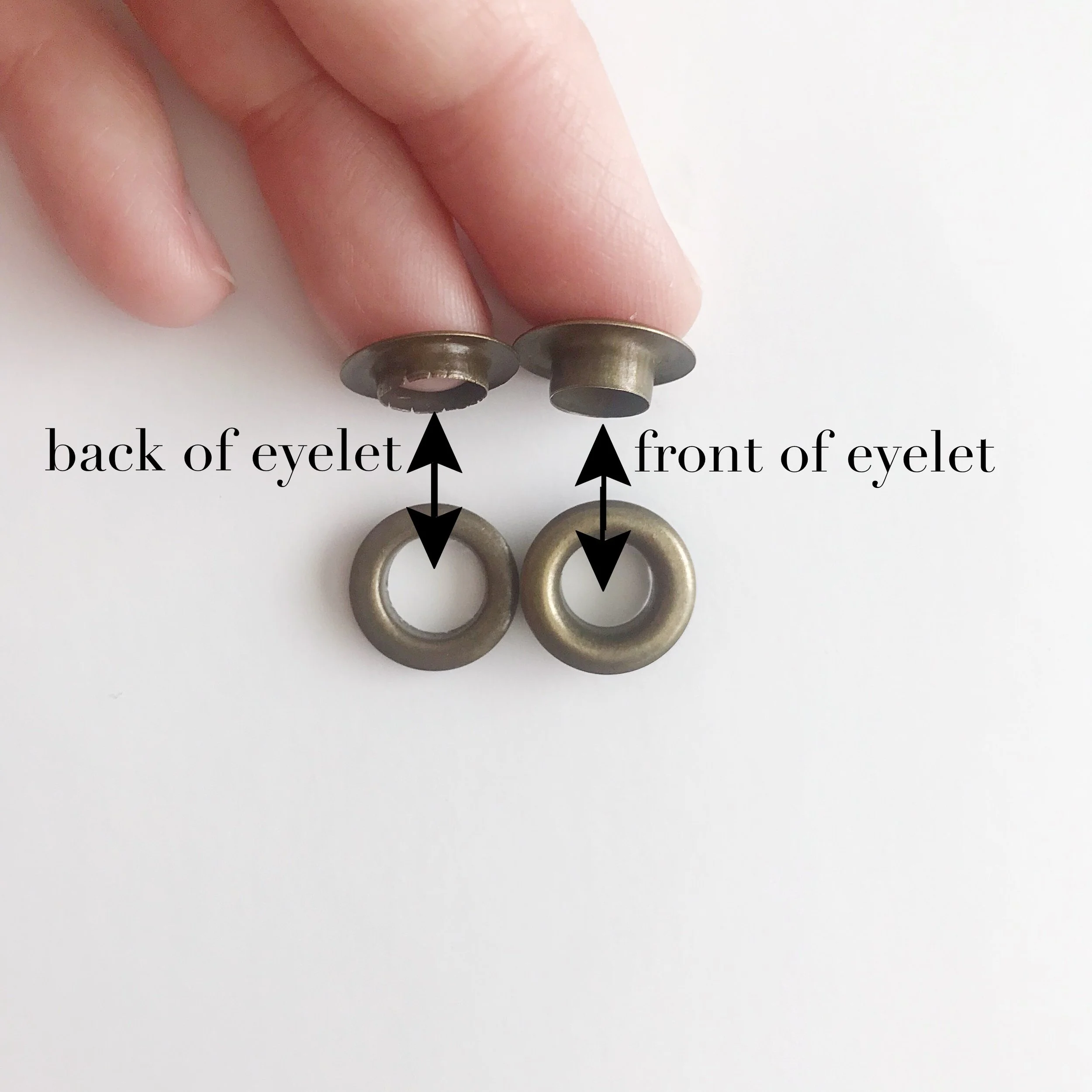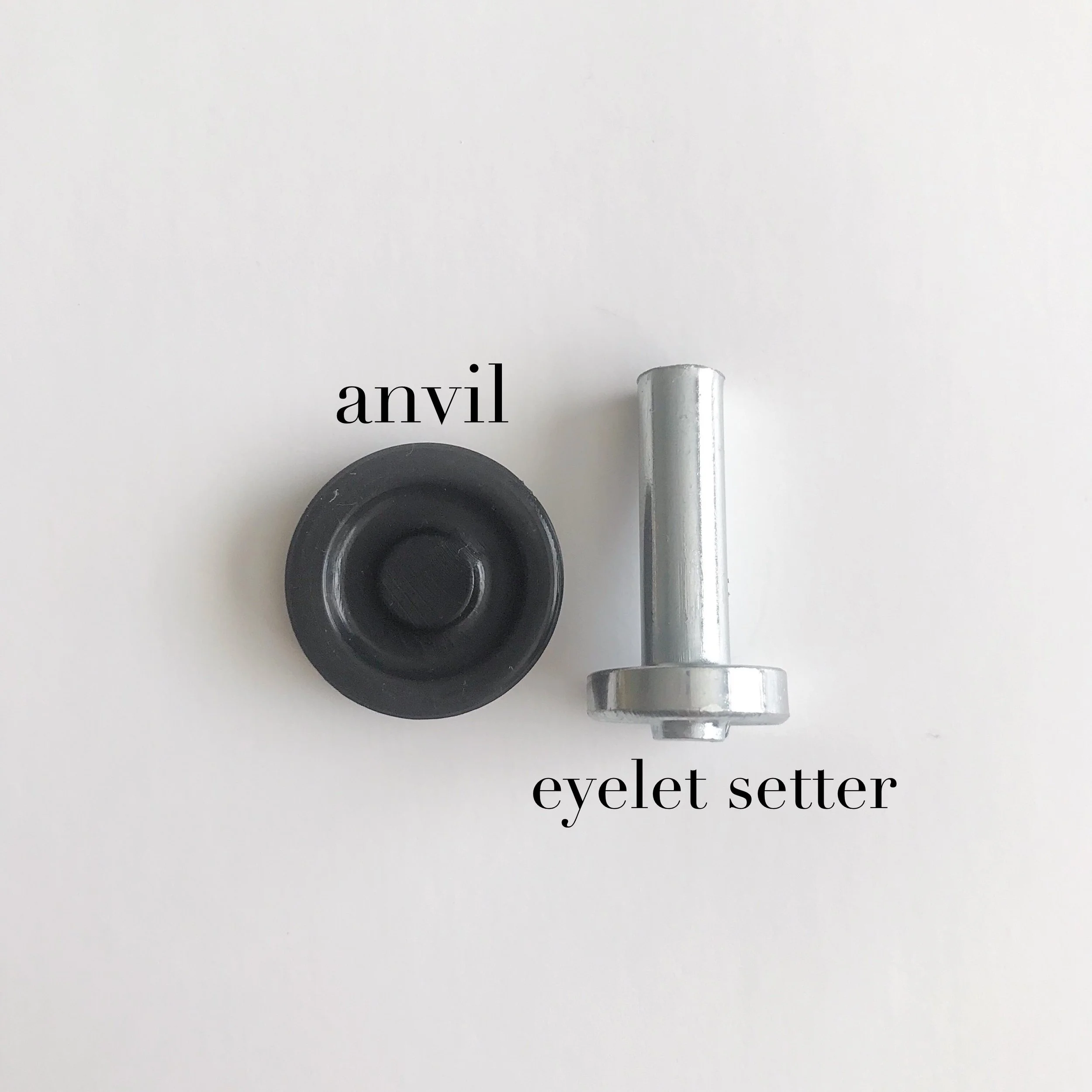 Above, you will see photos of the materials you will be using in this tutorial. The “back of eyelet” (above right photo shows two angles of the same labeled piece indicated by arrows) will be put in place first. The “anvil” (above left photo) is the surface you will place the “front of eyelet” when preparing to set it. The “eyelet setter” (above left photo) will hold it in the correct place as you attach it.
