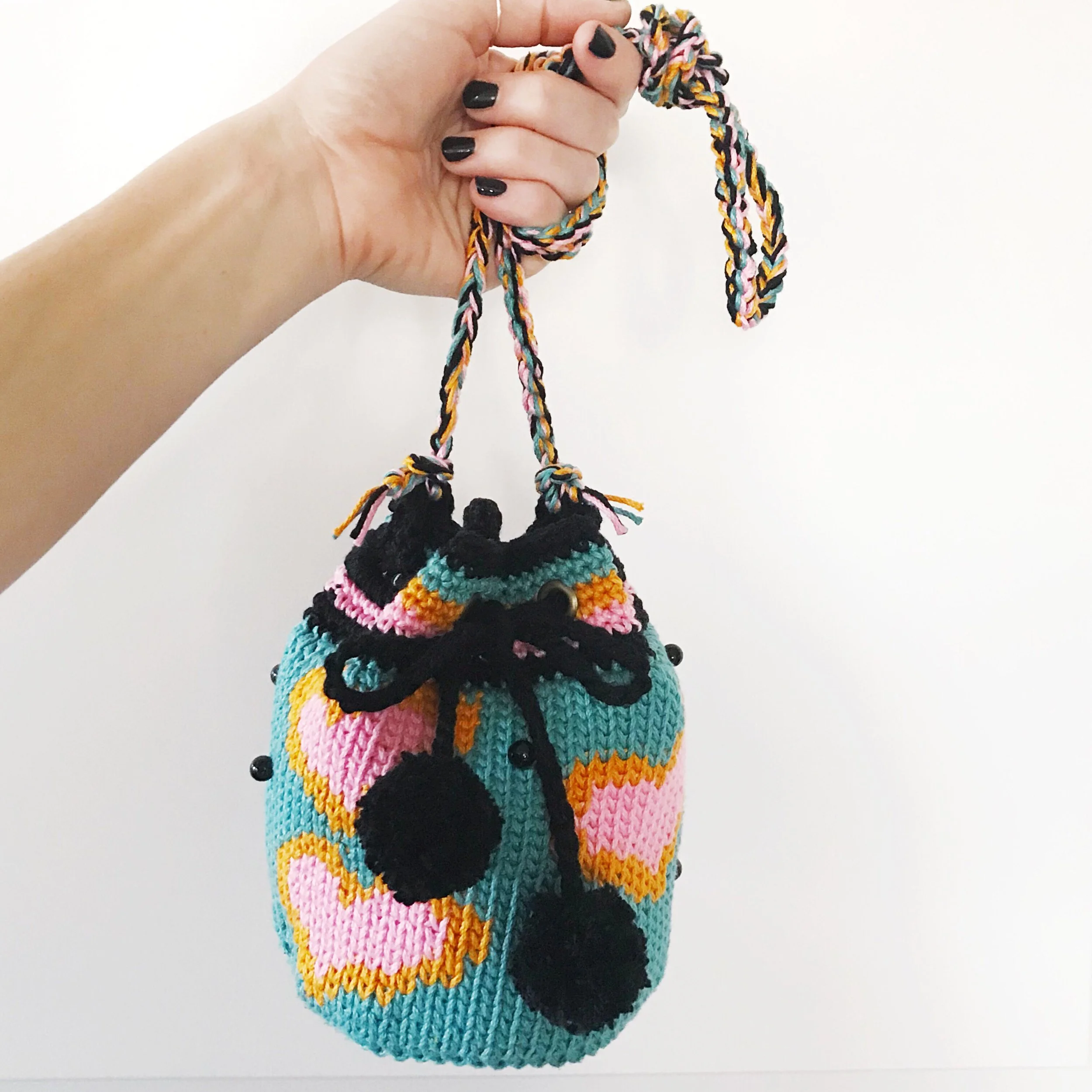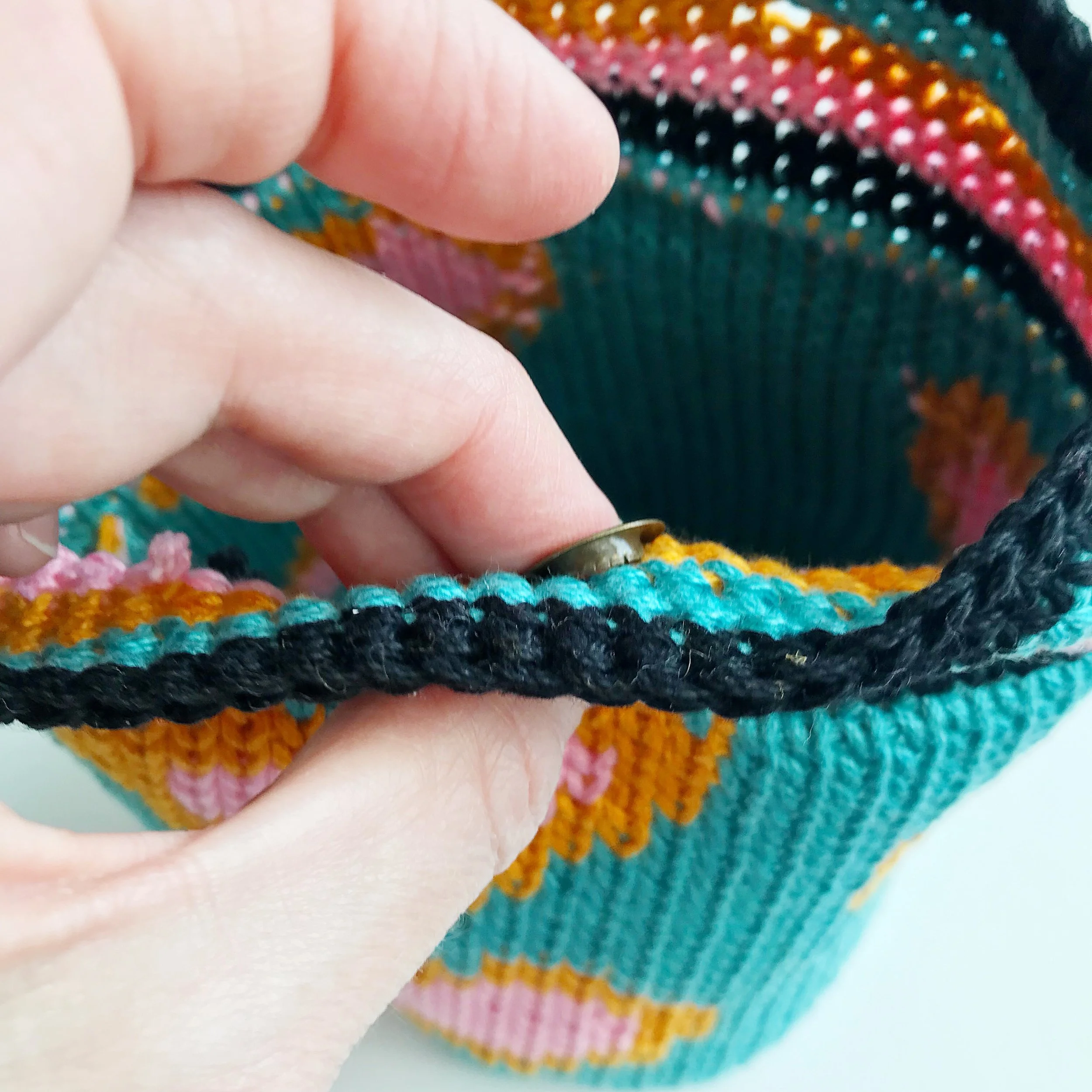 In the next section, the eyelets and extra embellishments for this tapestry crochet purse pattern (pom poms and beads) are optional, but I do recommend following the “Holes for Loops” and “Loops for Straps” portion, as it will give your handbag a more finished look.