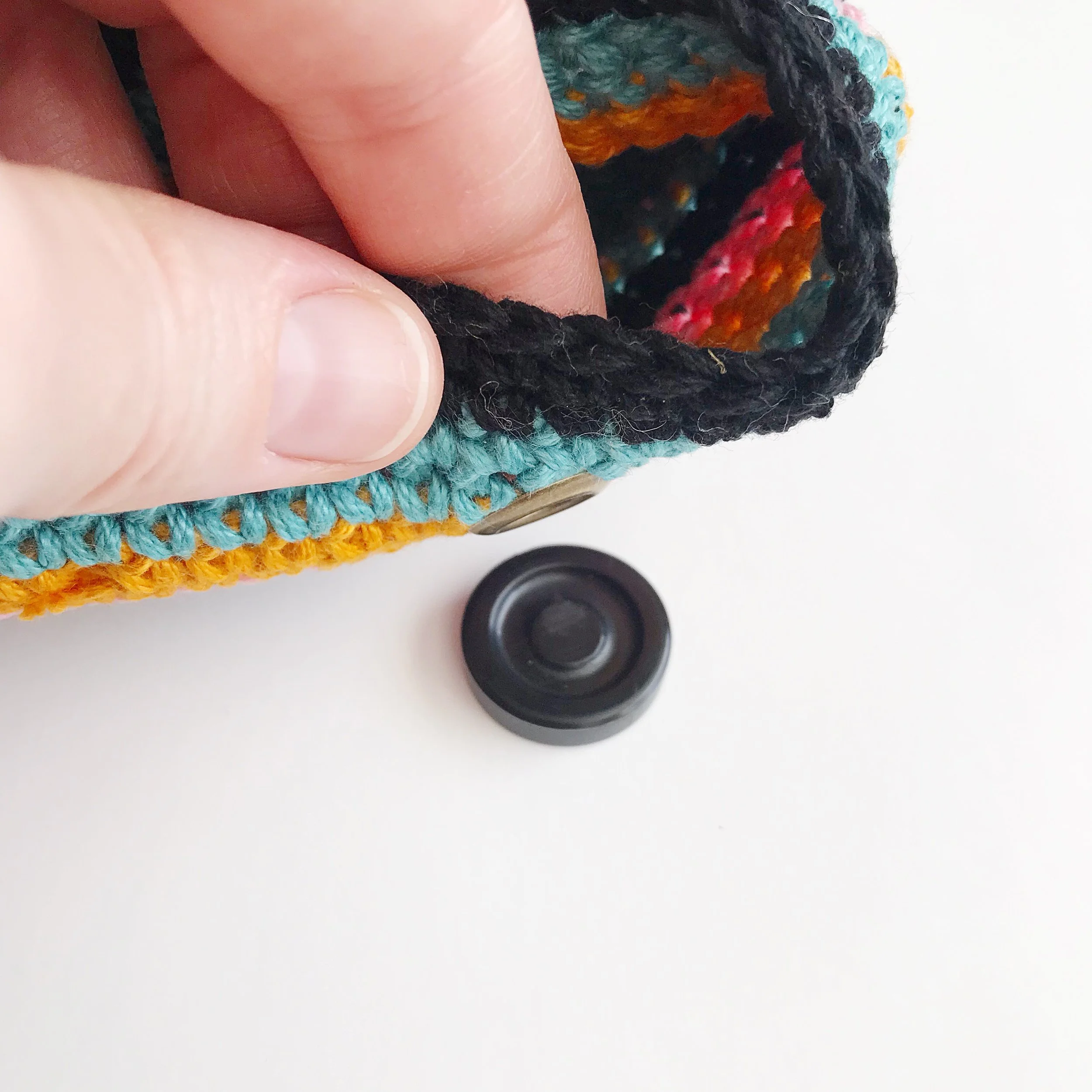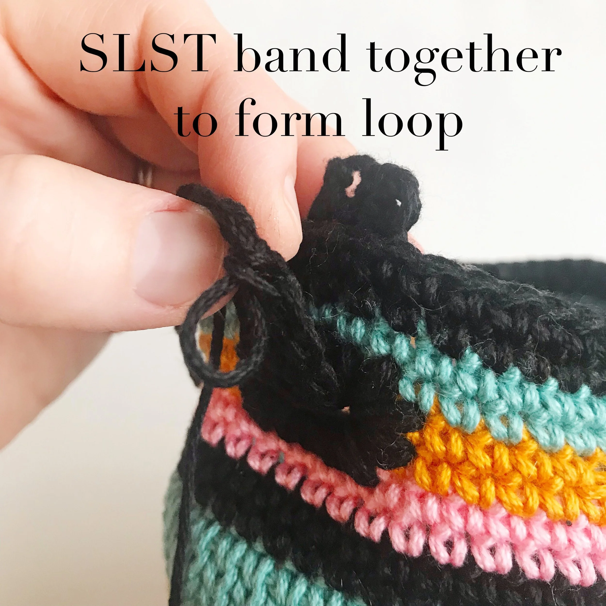 With right sides together, (above left photo) SLST band together to form loop around CH3 space. Fasten off. Weave in ends. Turn right side out. (above right photo)
