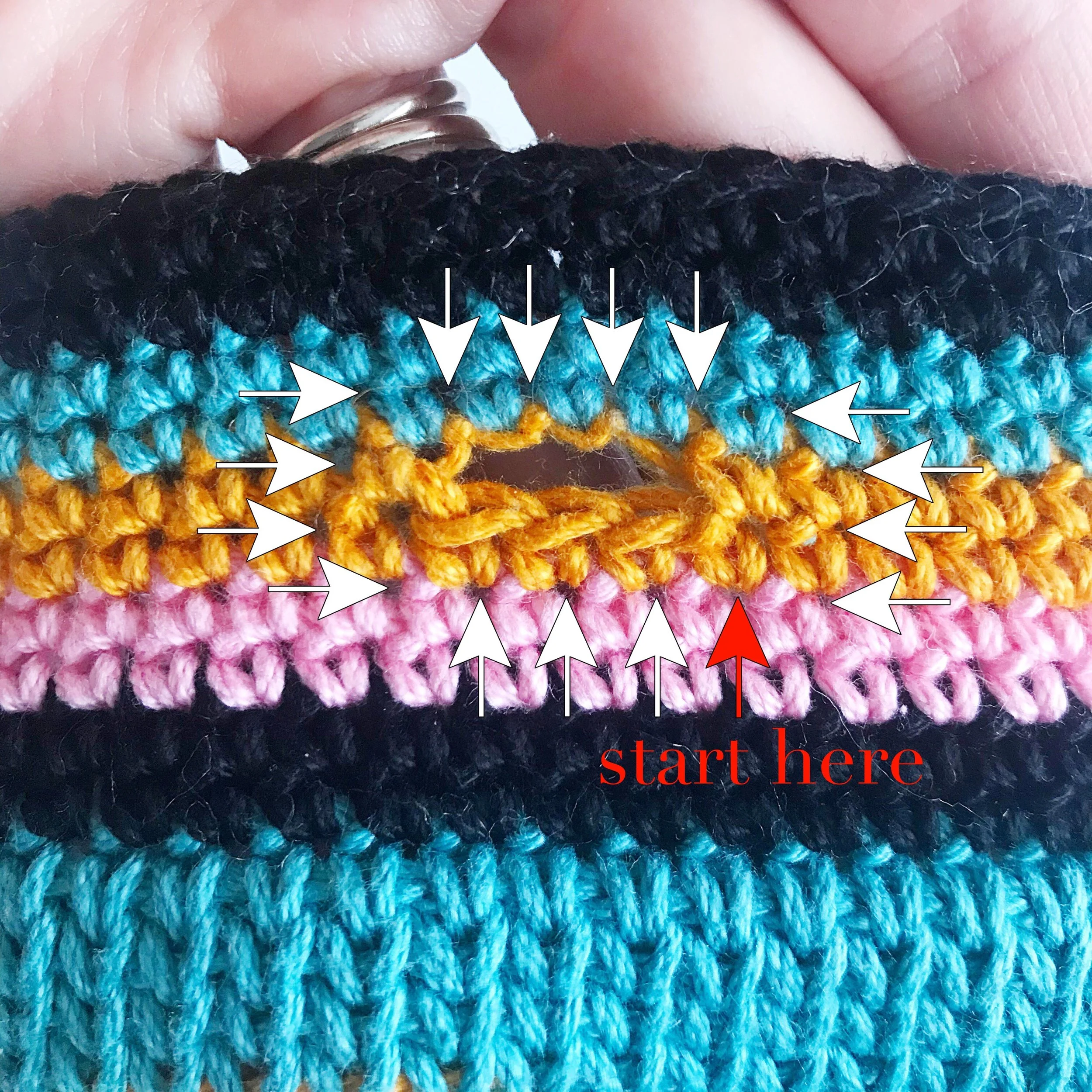 When working on the RS of your project, insert hook underneath the enclosed contrast color when making your single crochet stitches. (Right photo above) This will ensure your contrast color does not show as much in between changes.