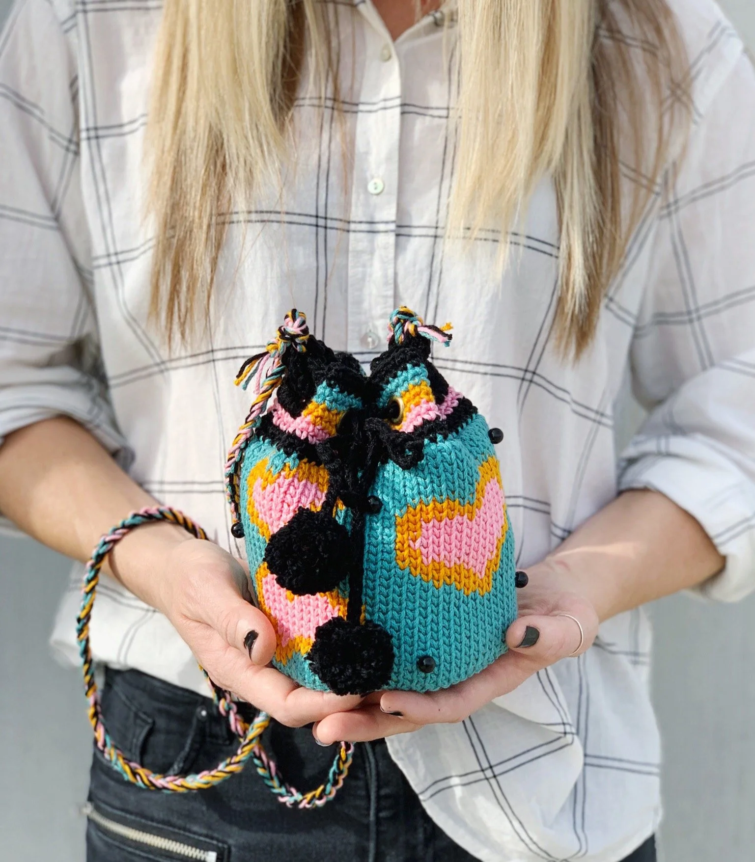 Holding one strand of each of Colors A, B, C, and D together, tightly CH 150 (approximately 50”) with US H/5mm hook. Fasten off and pull CH row tightly to secure. Making sure the flat side of your chain is facing down, (this means that the flat side will rest on your shoulder) tie your strap tightly in a knot around the loop you just made in the previous step. REP for loop on other side. Trim tail from CH row to desired length.