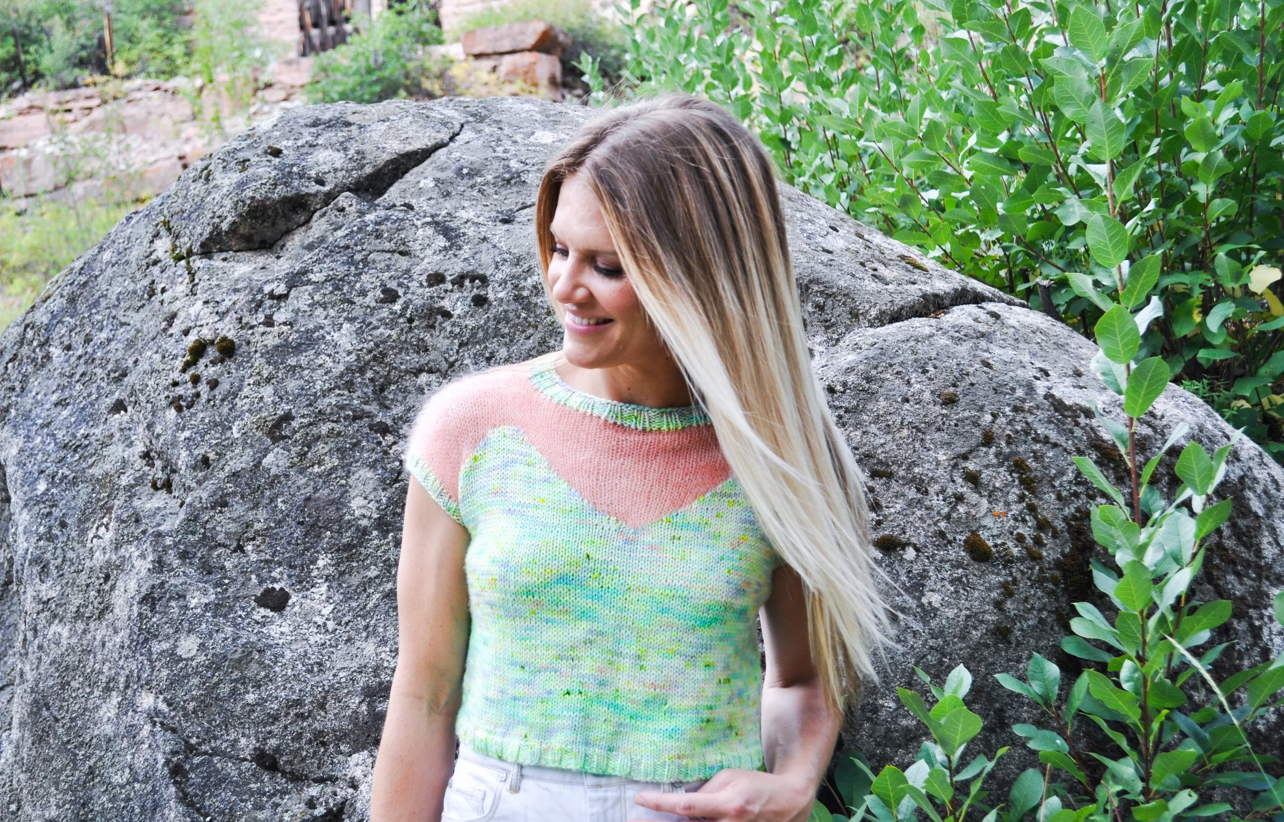 This was my As If Tee the first time around. (Find the full blog post about that [here]) As you can see, it's wearable, but I just wasn't quite happy with the fit. I was so excited to finish the first time, that I didn't make the back long enough. It fit ok, but I knew that I wouldn't wear it very often. And this pair of shorts may have been my only option for bottoms to wear with it. Hahaha ;) Also, This Spectrum Fibre yarn was wayyy too pretty to not get worn ALL the time. It was birthday splurge yarn for me, so my only option was to take it apart.